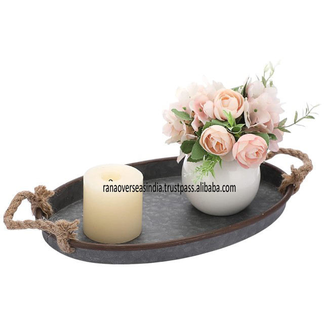 Top Vintage Style Oval Galvanized Metal Tray with Rope Handle