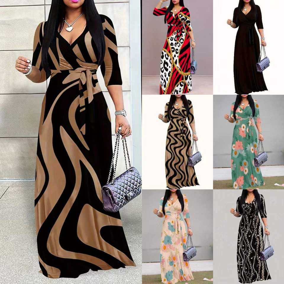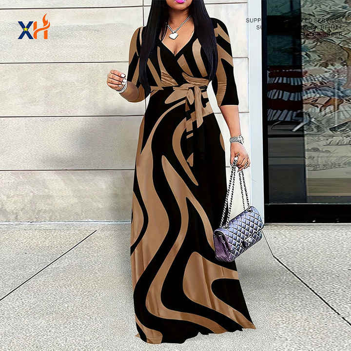 Top quality Custom Printing Autumn Trendy Lace-Up Women's Elegant Maxi Long Dress Casual Printed Breathable Natural Loose Dress