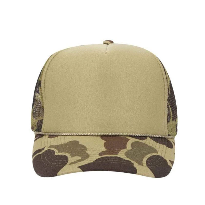 หมวกแก๊ปทรงทรัคเกอร์คุณภาพสูง ทนทาน ระบายอากาศได้ดี แบบ 6 แผง ผลิตตามสั่งจากโรงงาน พร้อมปักโลโก้ 5 แผง ลายพรางตาข่าย แบบมีตัวอักษร