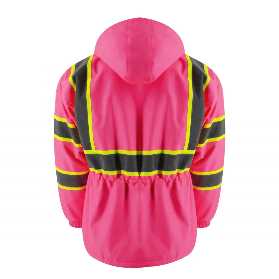 เสื้อแจ็คเก็ตทำงานแบบมีฮู้ดซ่อนในตัว คุณภาพสูง ผลิตจากโพลีเอสเตอร์ สะท้อนแสง มองเห็นได้ชัดเจน เหมาะสำหรับฤดูหนาว กันน้ำ บุซับในอย่างดี