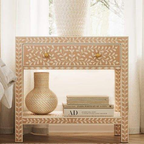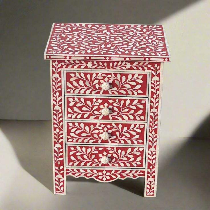 โต๊ะข้างเตียงฝังกระดูกทำมือ ลายดอกไม้ พร้อมลิ้นชักแบบกำหนดเอง เฟอร์นิเจอร์บ้านสไตล์อินเดียขัดเงา สำหรับใช้ในบ้านสไตล์ฟาร์มเฮาส์