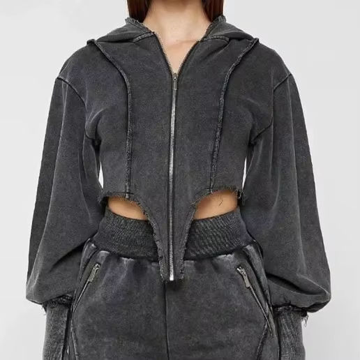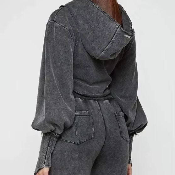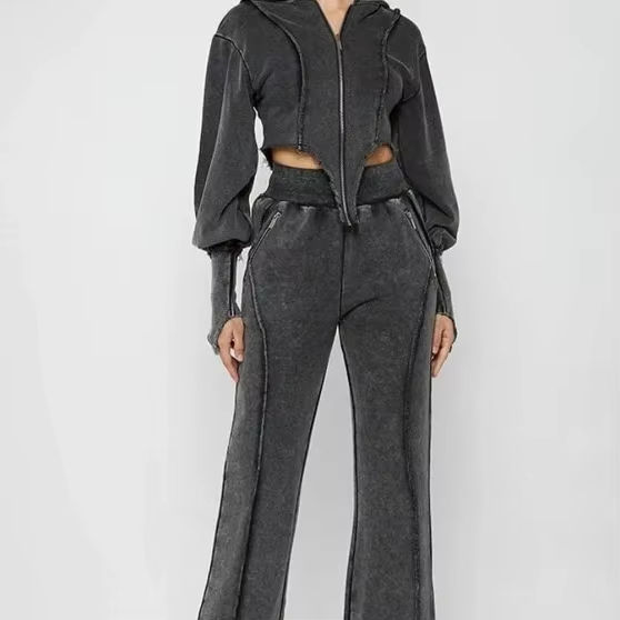 ชุดเซ็ตสองชิ้น เสื้อฮู้ดครอปซิปแบบฟิตติ้งสำหรับผู้หญิง สไตล์วินเทจฟอกสีดำ พร้อมกางเกงขายาวเข้าชุด กำลังเป็นที่นิยม