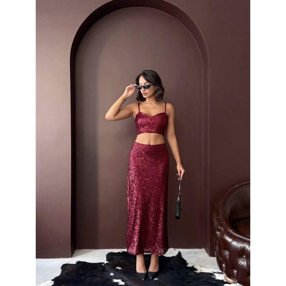 ท็อปโชว์ กระโปรงเดรสยาวประดับเลื่อมเบอร์กันดี