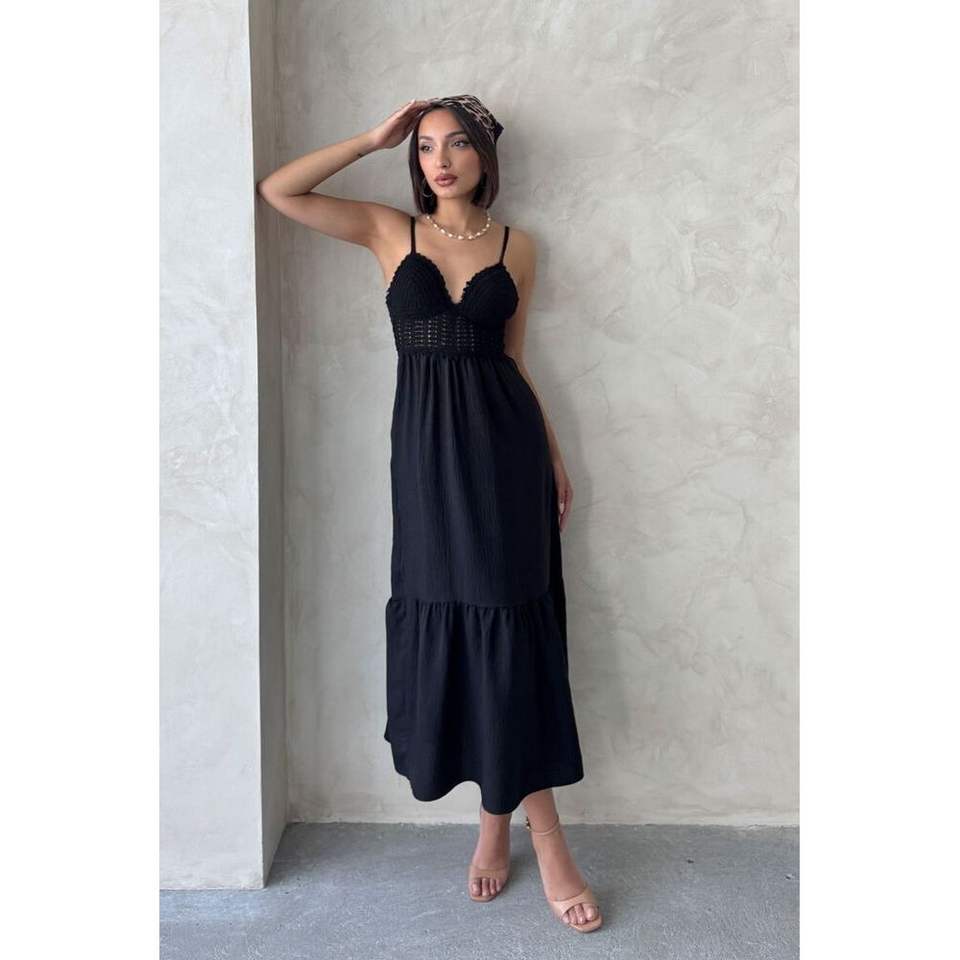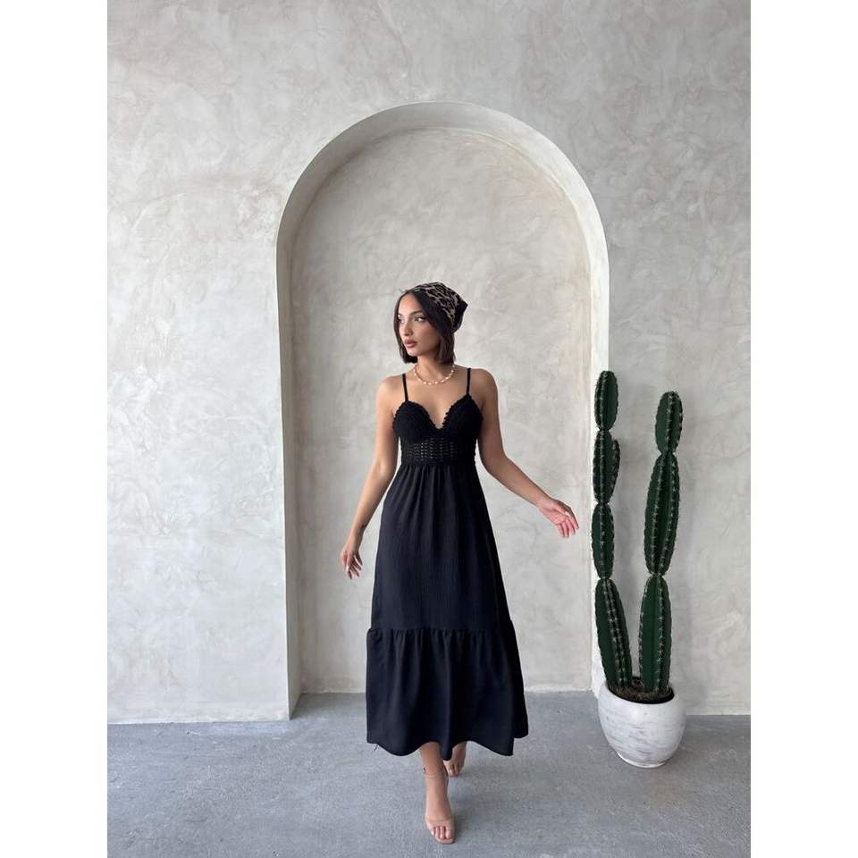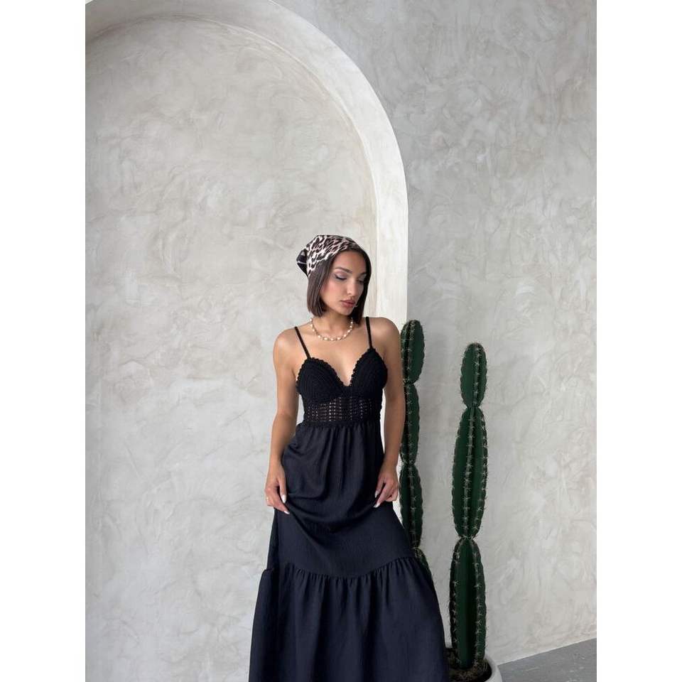 เดรสลำลองขายส่ง Topshow สีดำ ผ้าลินิน สายเดี่ยว คอวี ดีไซน์ยาวเต็มตัว