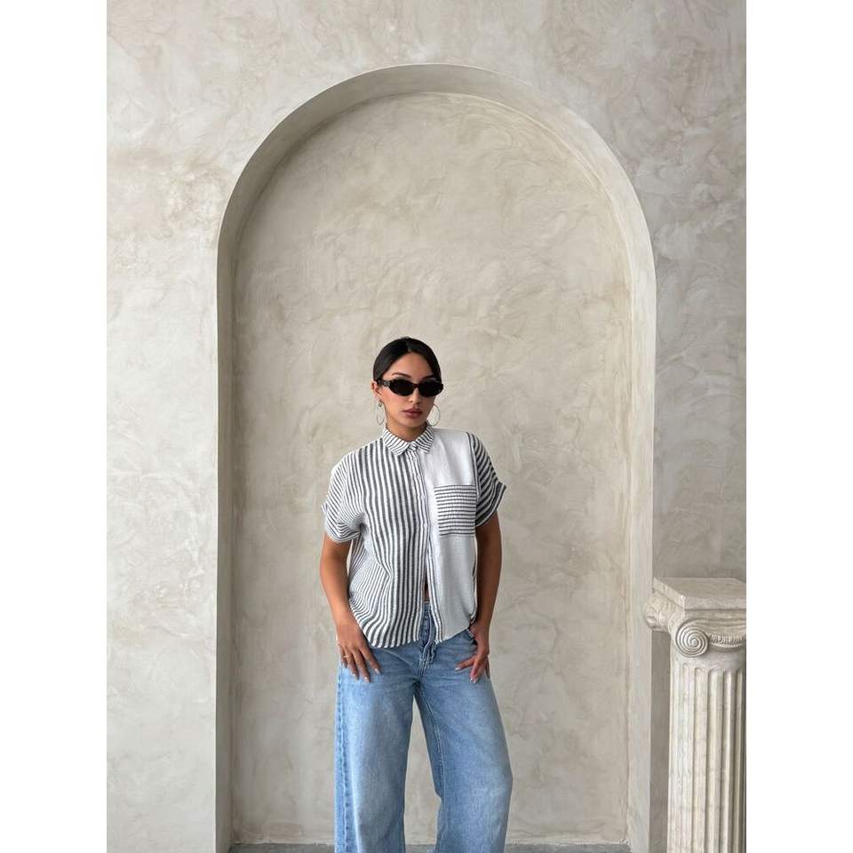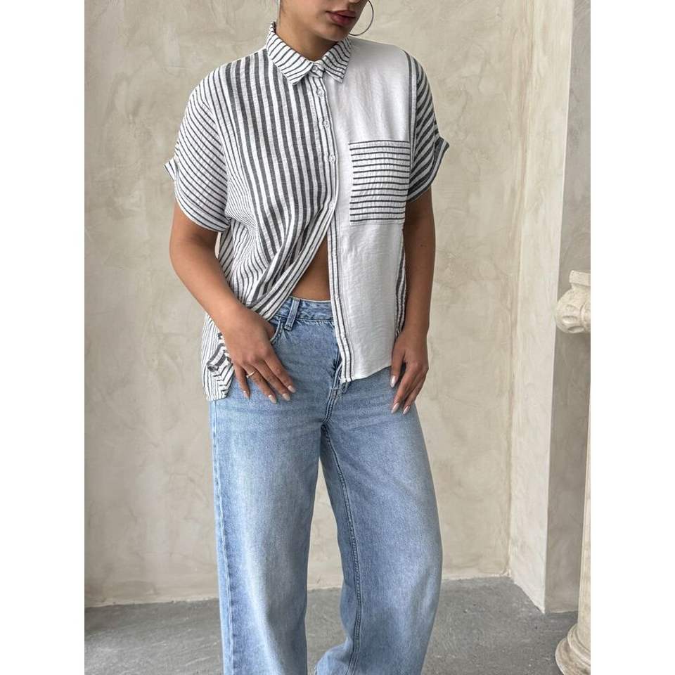 เสื้อเชิ้ตและเสื้อเบลาส์ลายทางสีดำสำหรับผู้หญิงขายส่ง Topshow
