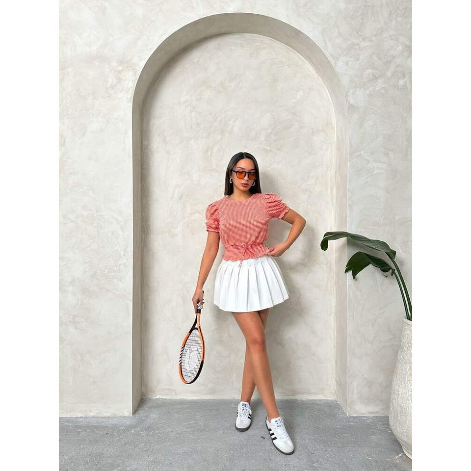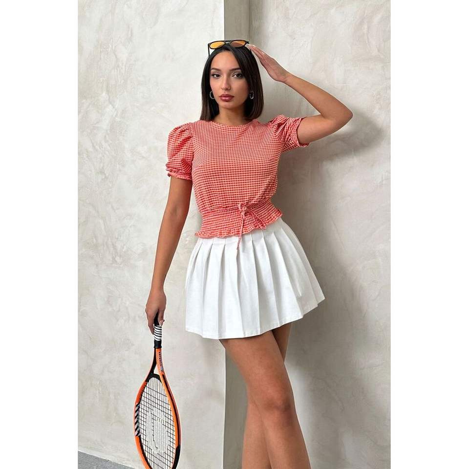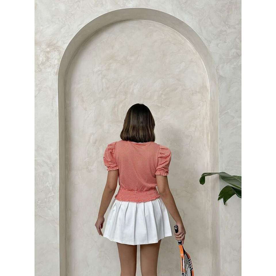 เสื้อเบลาส์และเสื้อเชิ้ตสตรีเอวสีส้มเสื้อเบลาส์ลายตาราง
