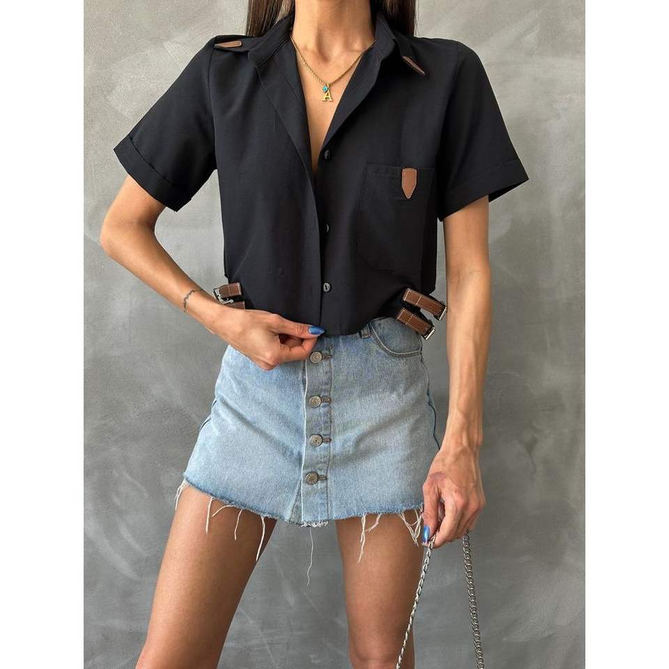 เสื้อผู้หญิง Topshow ขายส่ง เสื้อเชิ้ตสีดำประดับเข็มขัด