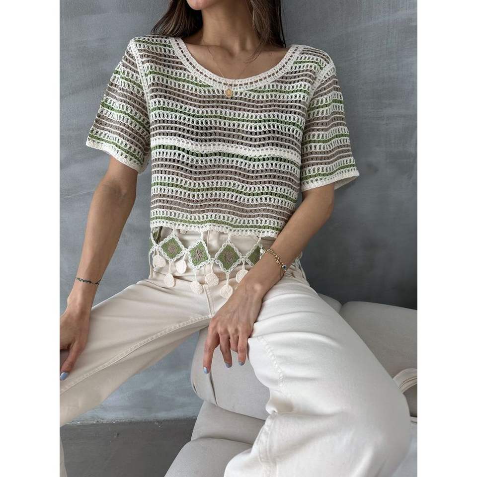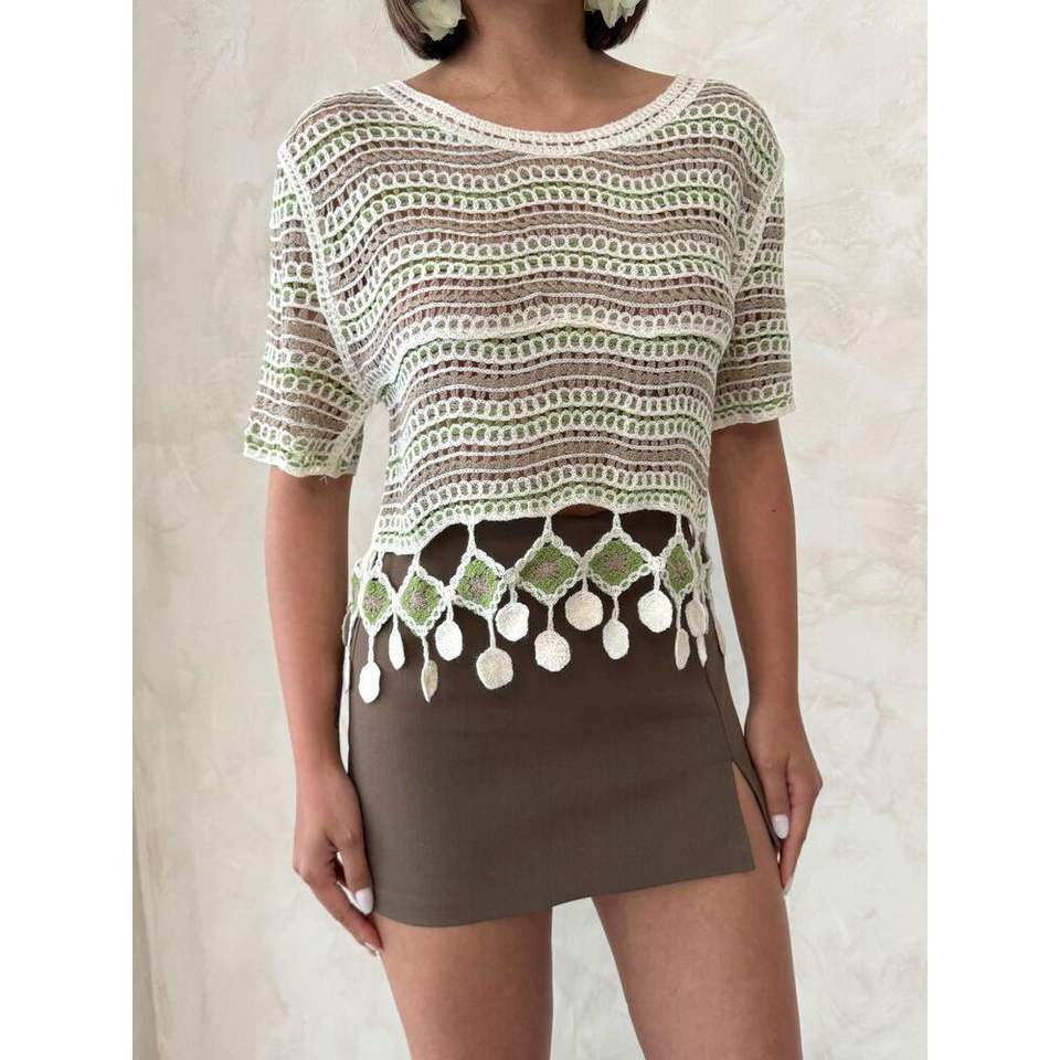 เสื้อเบลาส์ตาข่ายสีเขียวมรกตประดับพู่ห้อยหกอันสำหรับผู้หญิงจาก Topshow เสื้อแฟชั่นขายส่ง