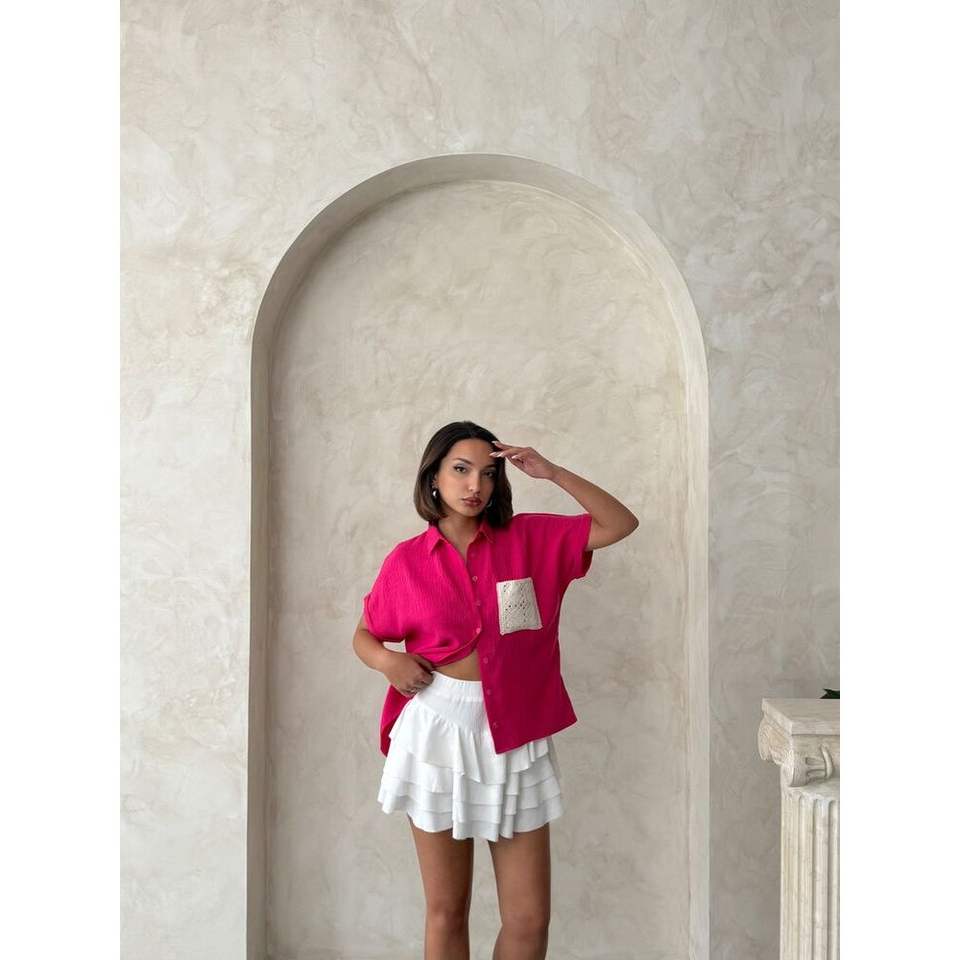 เสื้อเชิ้ตผ้าลินินสีชมพูบานเย็นสำหรับผู้หญิง ยี่ห้อ Topshow พร้อมกระเป๋าและงานปัก ขายส่ง