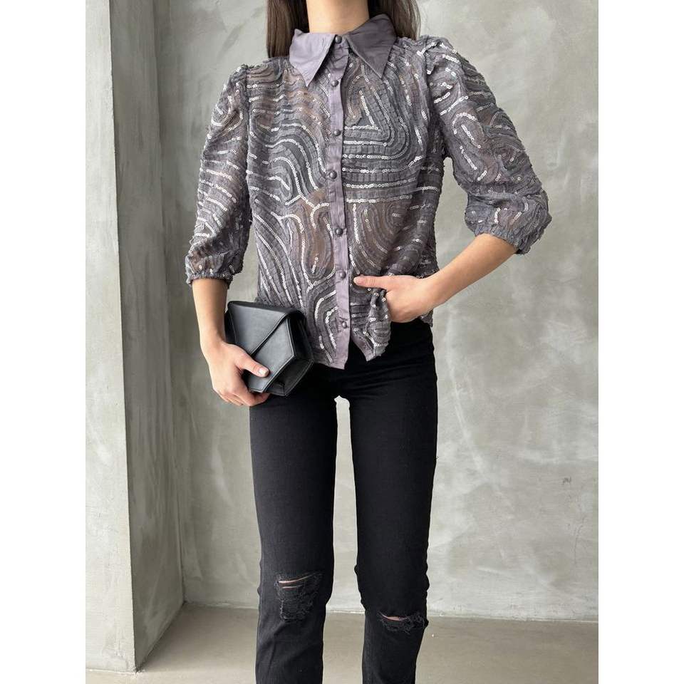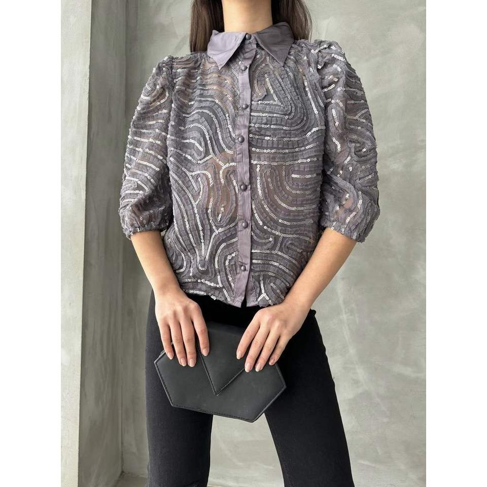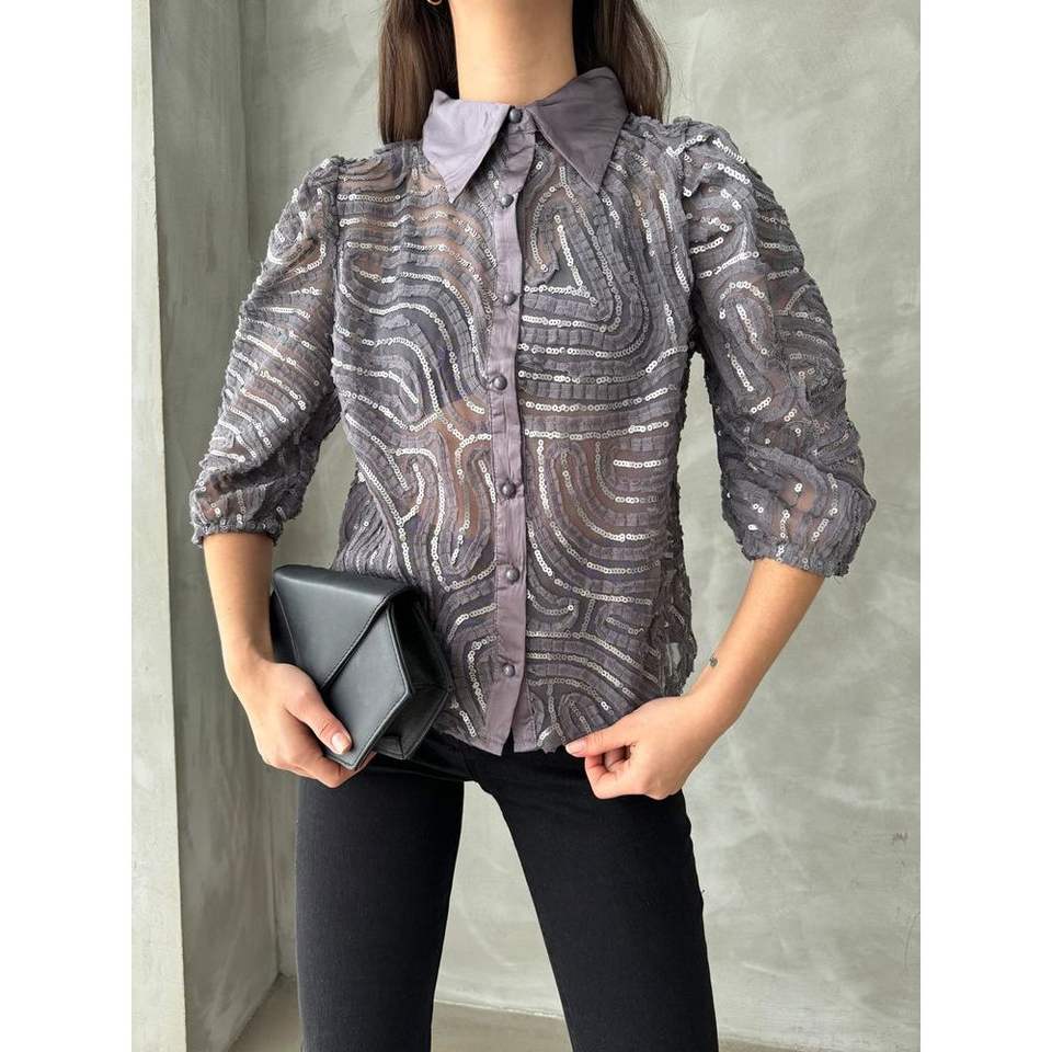 Topshow Women's Grey Sequin Embroidered Tulle Shirts Wholesale Blouses & Tops