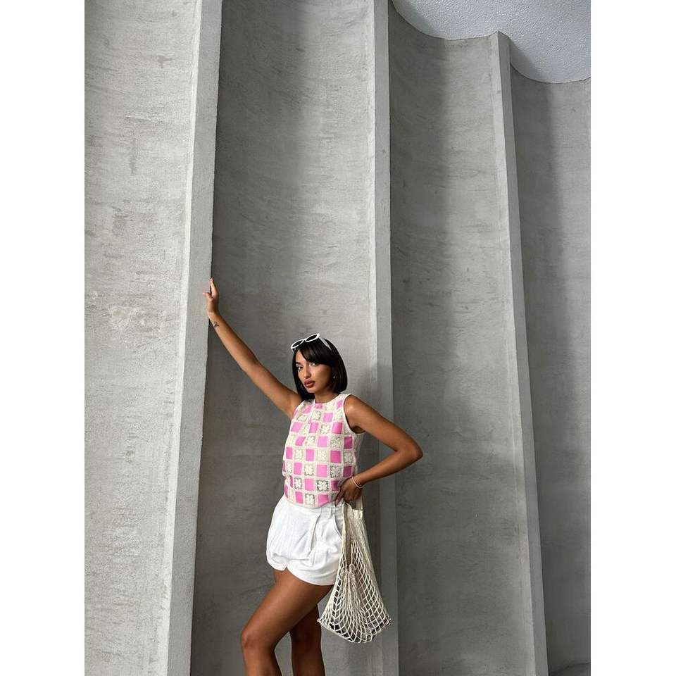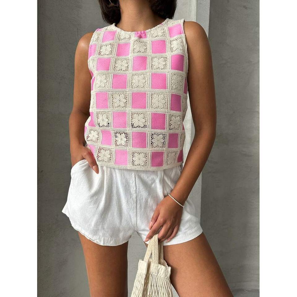เสื้อครอปแขนกุดลายตารางหมากรุกสำหรับผู้หญิง สีชมพูอ่อน ขายส่ง