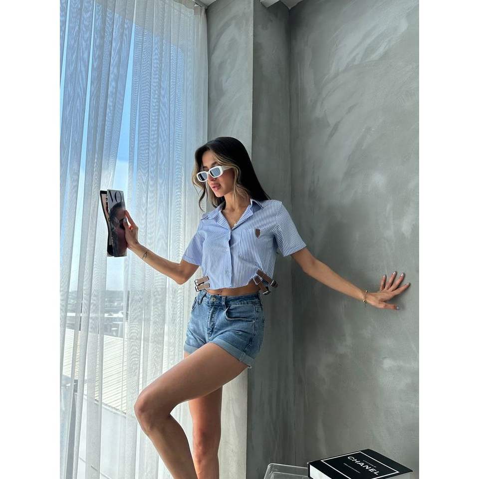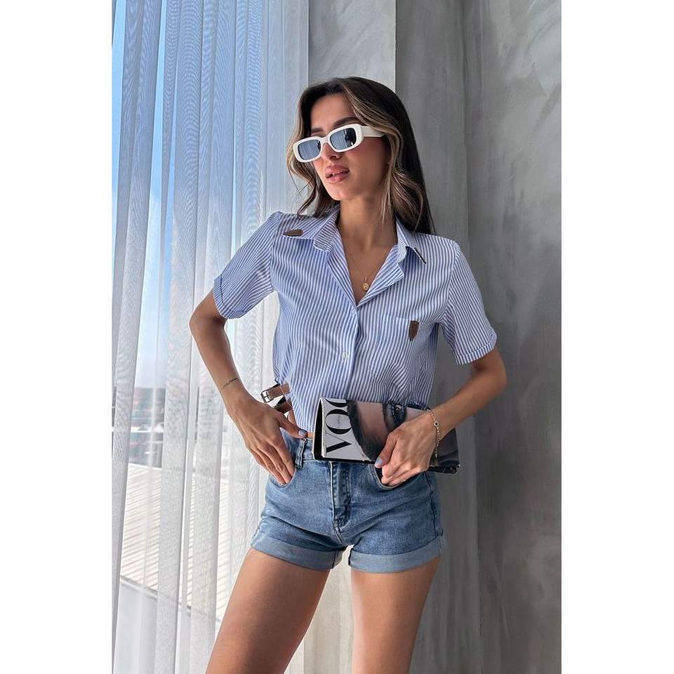 เสื้อเชิ้ตและเสื้อเบลาส์ลายทางสำหรับผู้หญิง Topshow ขายส่ง พร้อมดีเทลเข็มขัดสีน้ำเงิน