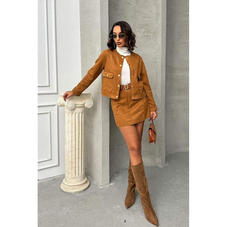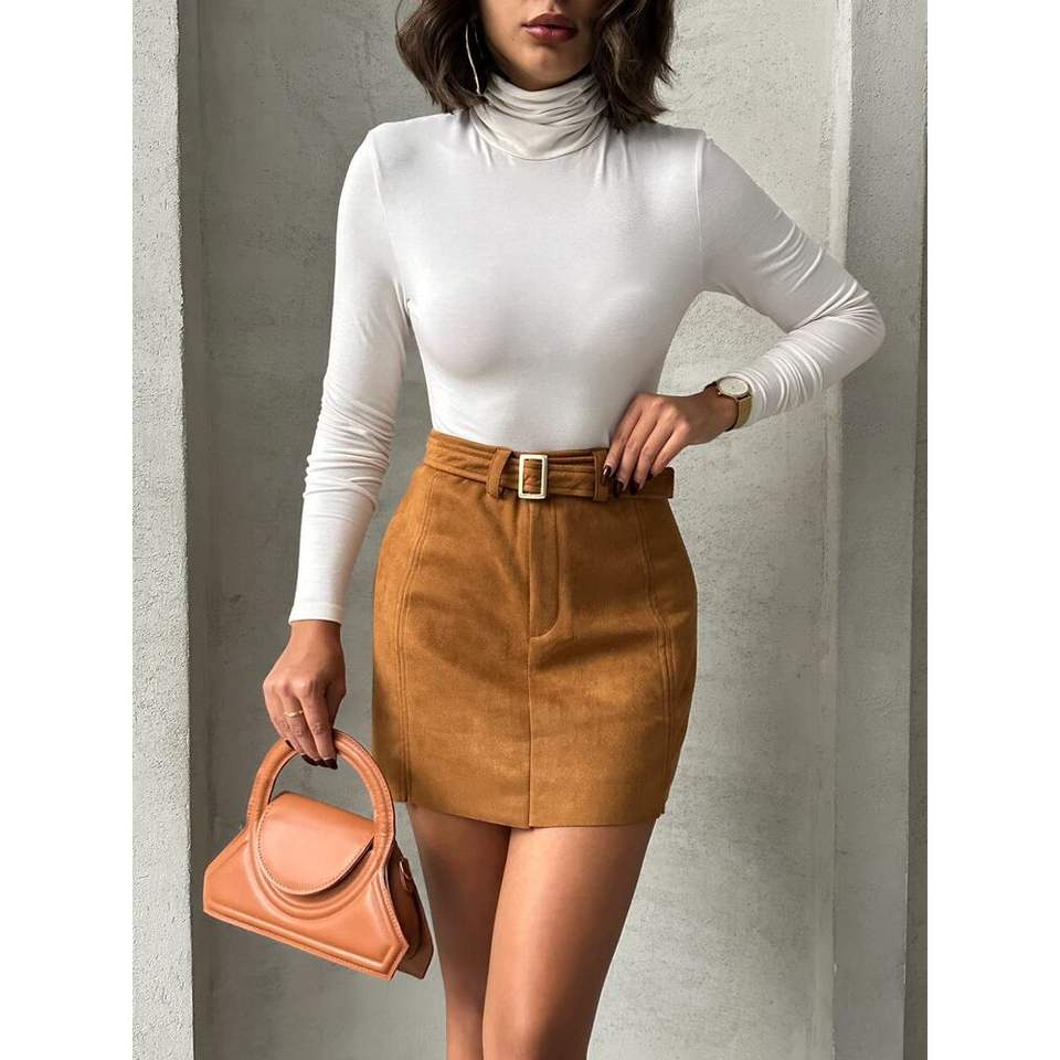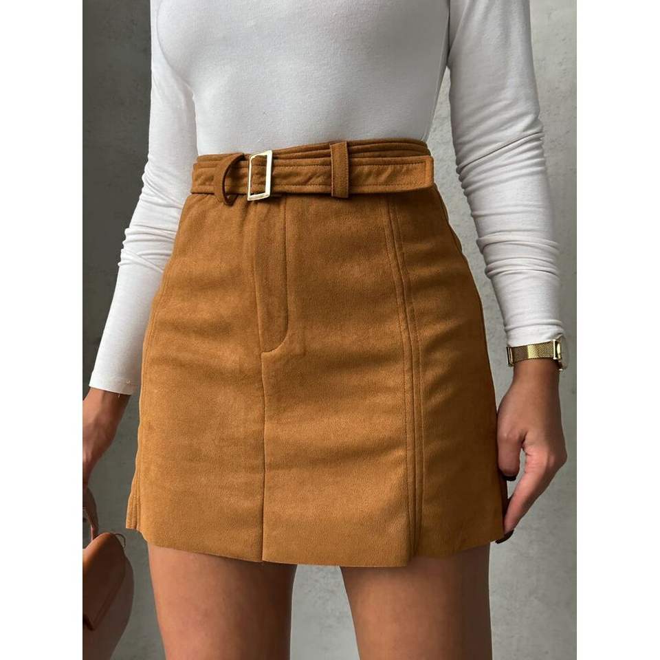 กระโปรงผู้หญิงแบบมีเข็มขัดสีแทน