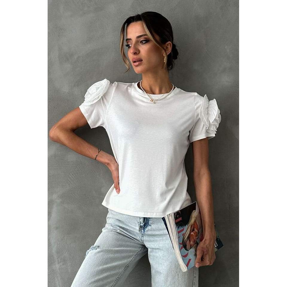 เสื้อยืดสีขาวสำหรับผู้หญิงลายดอกกุหลาบที่ไหล่-มีบริการขายส่ง