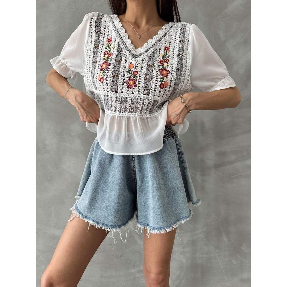 เสื้อเบลาส์และเสื้อเชิ้ตผู้หญิงปักลายสีครีมเทา ยี่ห้อ Topshow ขายส่ง