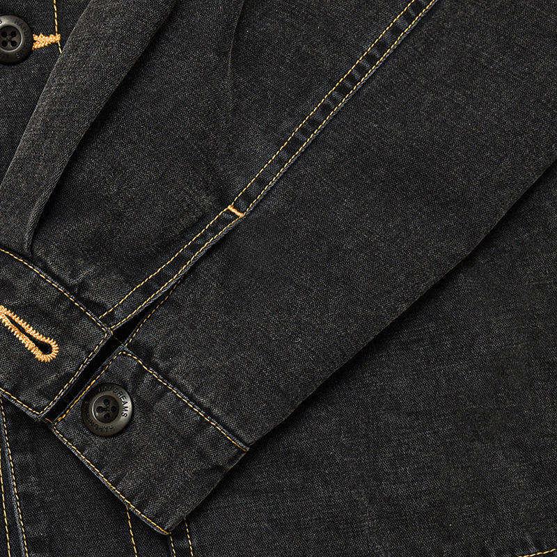 Topstit แจ็กเก็ตยีนส์สีดำย้อนยุคของผู้ชาย, เสื้อโค้ทปกกว้างทรงหลวมลายปะต่อทันสมัยสำหรับฤดูหนาว