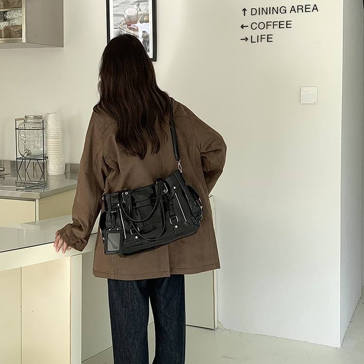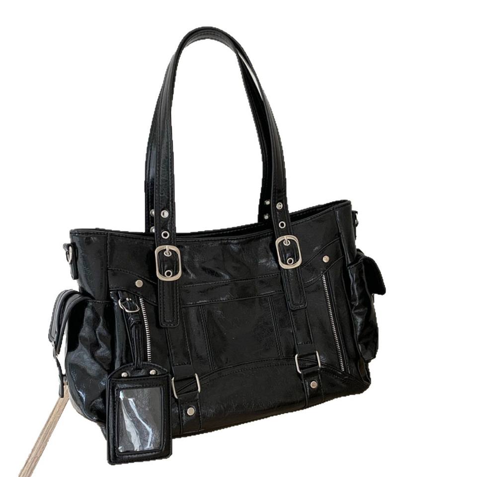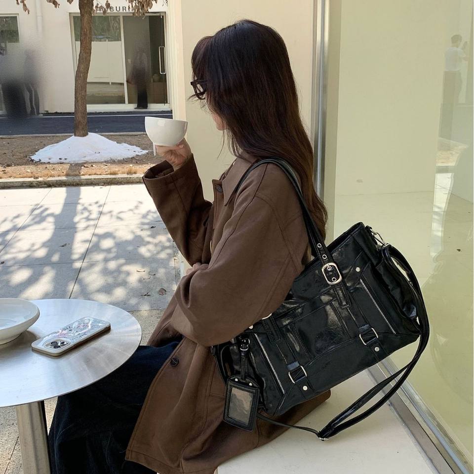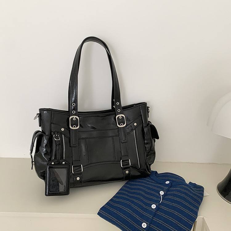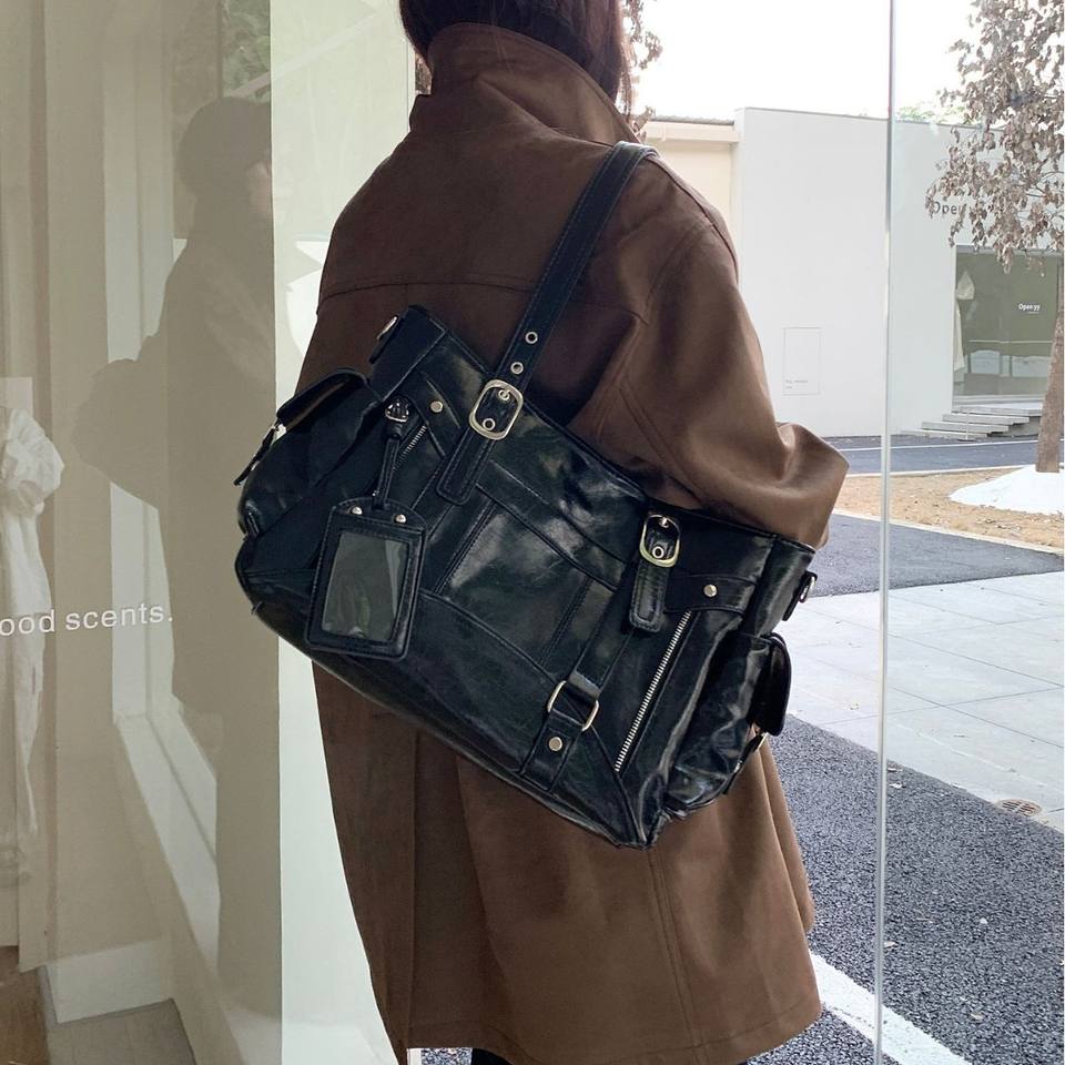 กระเป๋าโท้ท ความจุขนาดใหญ่ สีดำ กันน้ำ กระเป๋าสะพายไหล่สำหรับเดินทางทุกวัน สีพื้น แต่งด้ายเย็บ คอลเลคชั่นฤดูใบไม้ร่วง 2025
