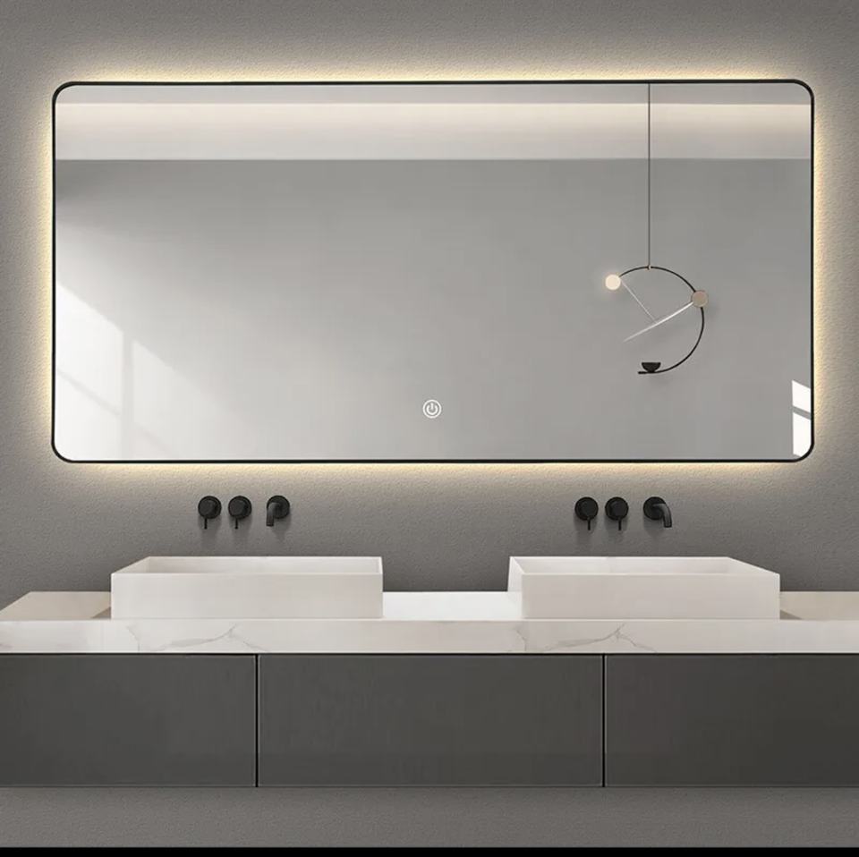 กระจก LED แบบสัมผัสกระจกห้องน้ำสไตล์วินเทจที่สวยงามอุปกรณ์ตกแต่งในห้องน้ำทรงสี่เหลี่ยมสีดำสีขาวทอง