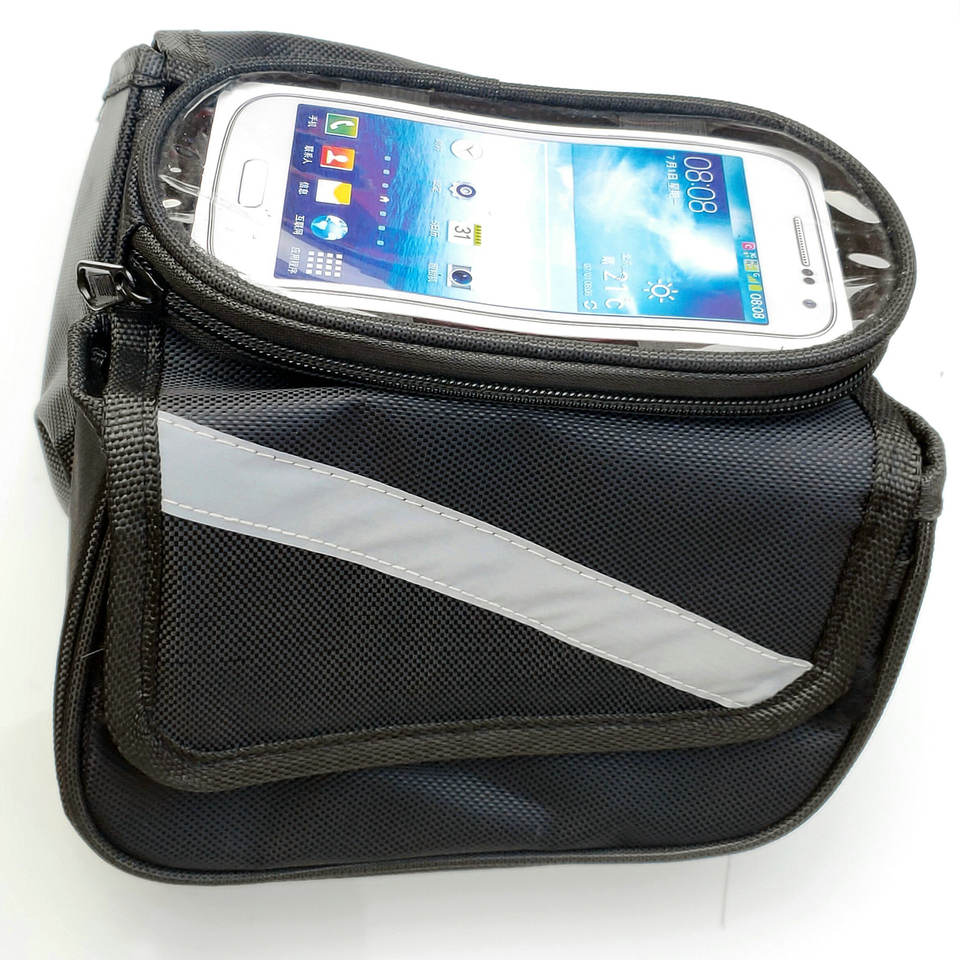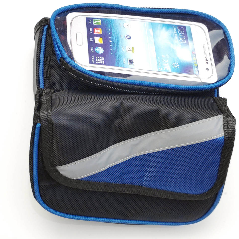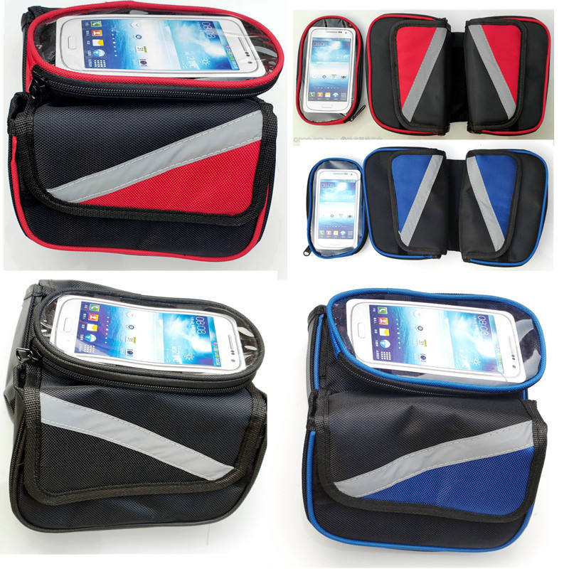 กระเป๋าอานแบบหน้าจอสัมผัสสำหรับโครงจักรยานด้านหน้าพร้อมช่องใส่โทรศัพท์ สีแดง สีน้ำเงิน สีดำ วัสดุโพลีเอสเตอร์