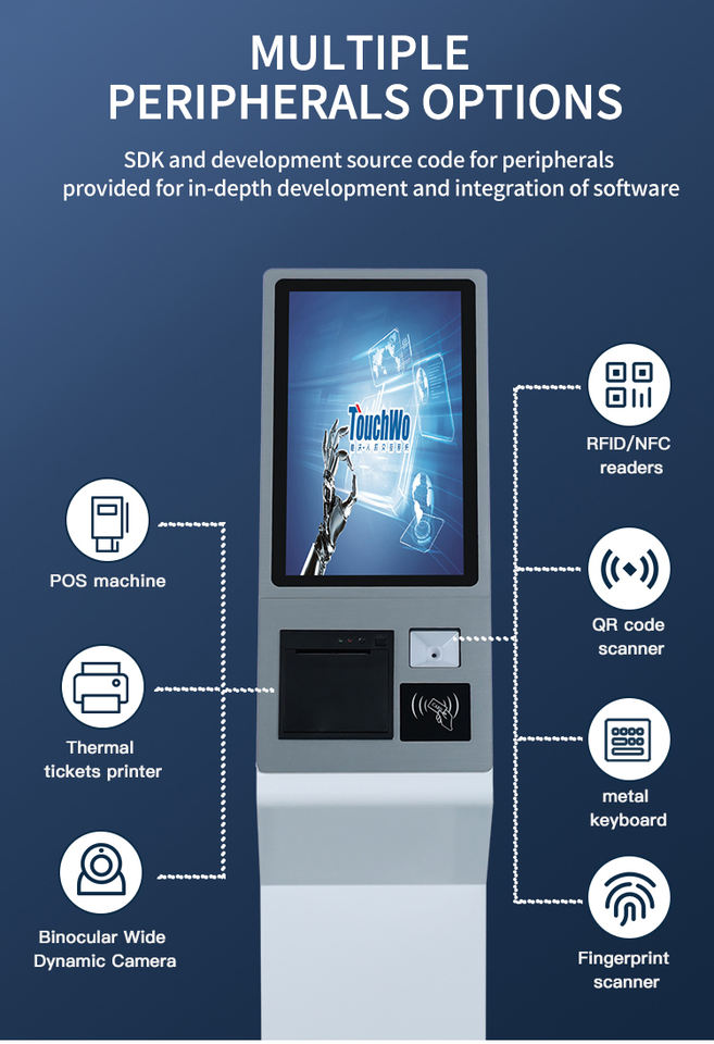 หน้าจอสัมผัสแบบตั้งพื้นขนาด 15.6 21.5 32 นิ้ว ระบบสัมผัสแบบอินเทอร์แอคทีฟ บริการตนเอง ระบบแอนดรอยด์ POS SDK พร้อมเครื่องพิมพ์ในตัวสำหรับใช้งานภายในอาคาร