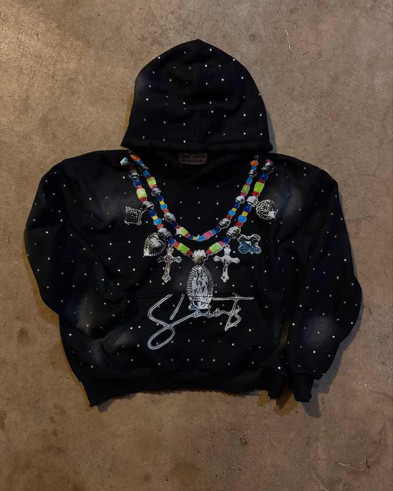 Tracksuit Manufacturer Custom Diamond Rhinestone Acid Wash Zipper Rhinestone Sweat Suit Flared Sweatpants and Hoodie Set Men