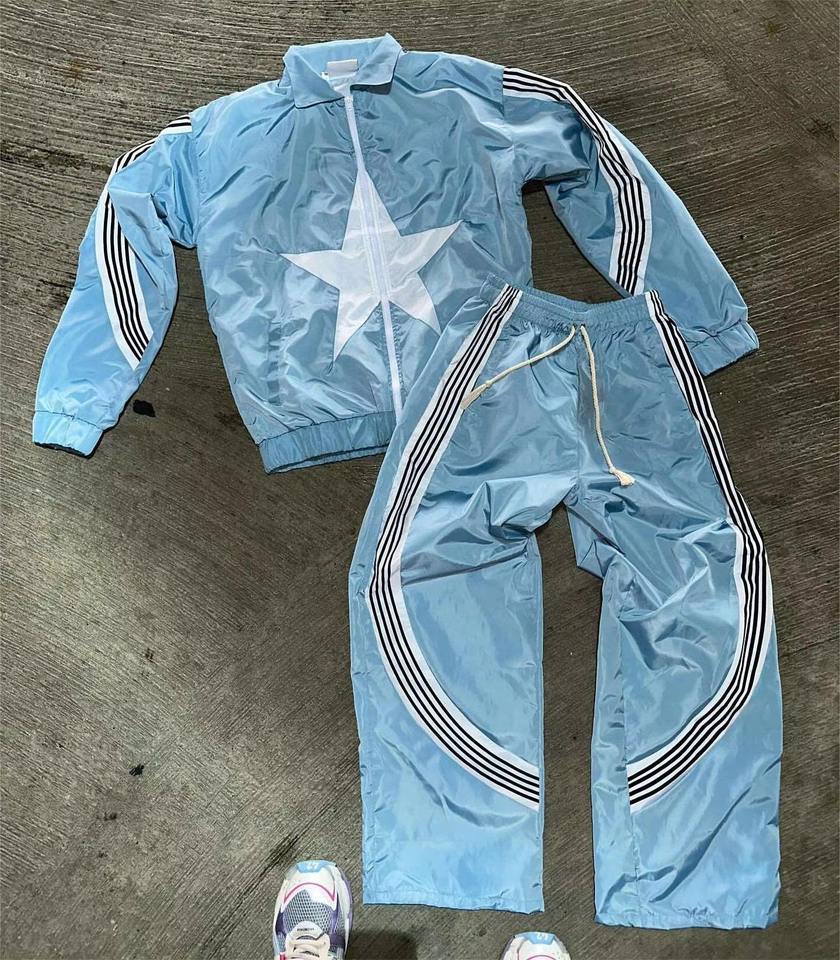 ชุดวอร์มกันลมแบบเรียบง่าย เป็นมิตรกับสิ่งแวดล้อม ระบายอากาศได้ดี ทำจากไนลอน สำหรับผู้ชาย ชุดสองชิ้น แบบต่อผ้า ซิปแจ็คเก็ตและกางเกงขายาว สามารถสั่งทำได้