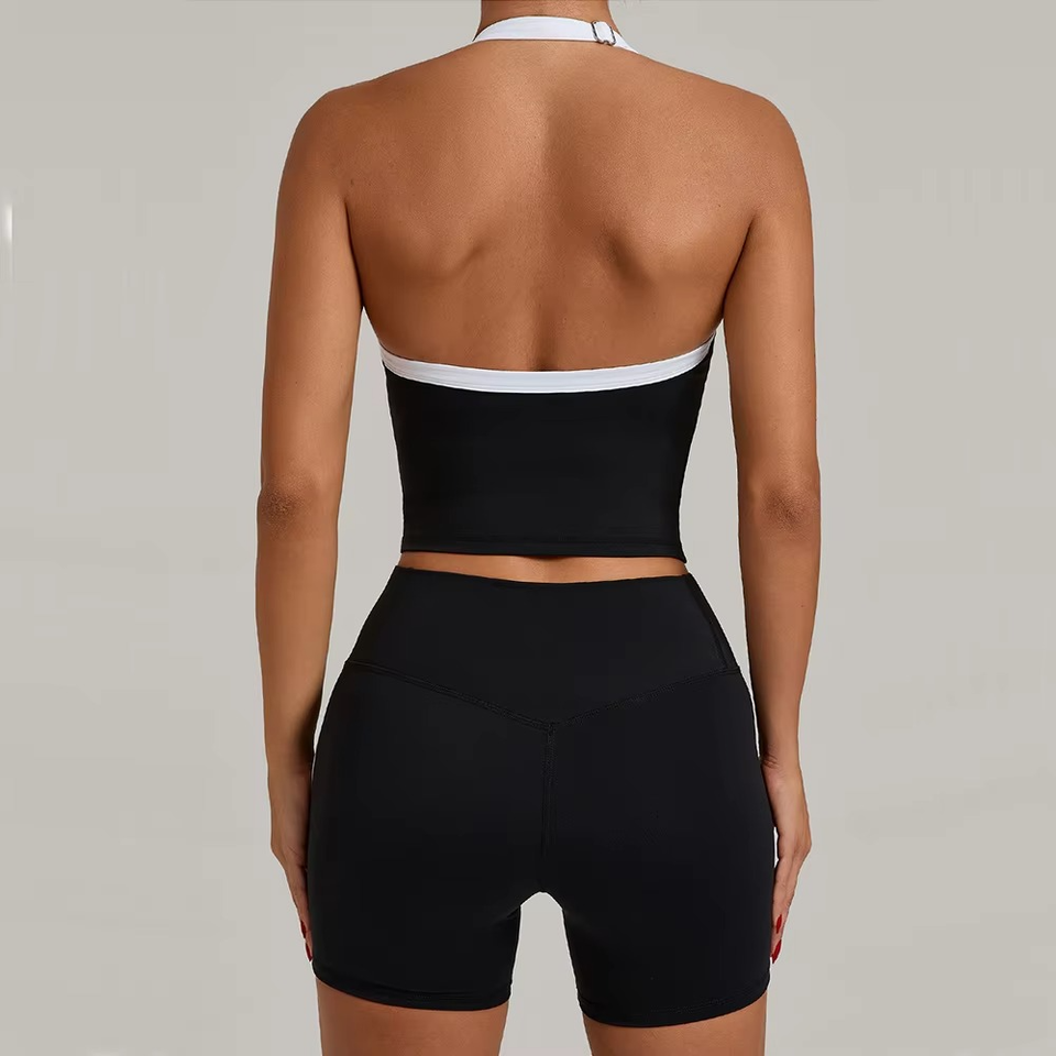 เซ็ต2ชิ้นสำหรับเล่นโยคะชุดออกกำลังกายแบบเปลือยสัมผัสชุดวอร์มสำหรับผู้หญิงชุดออกกำลังกายกางเกงขาสั้นโยคะเอวสูงชุดชั้นในกีฬาแบบห้อยคอชุดสั้น