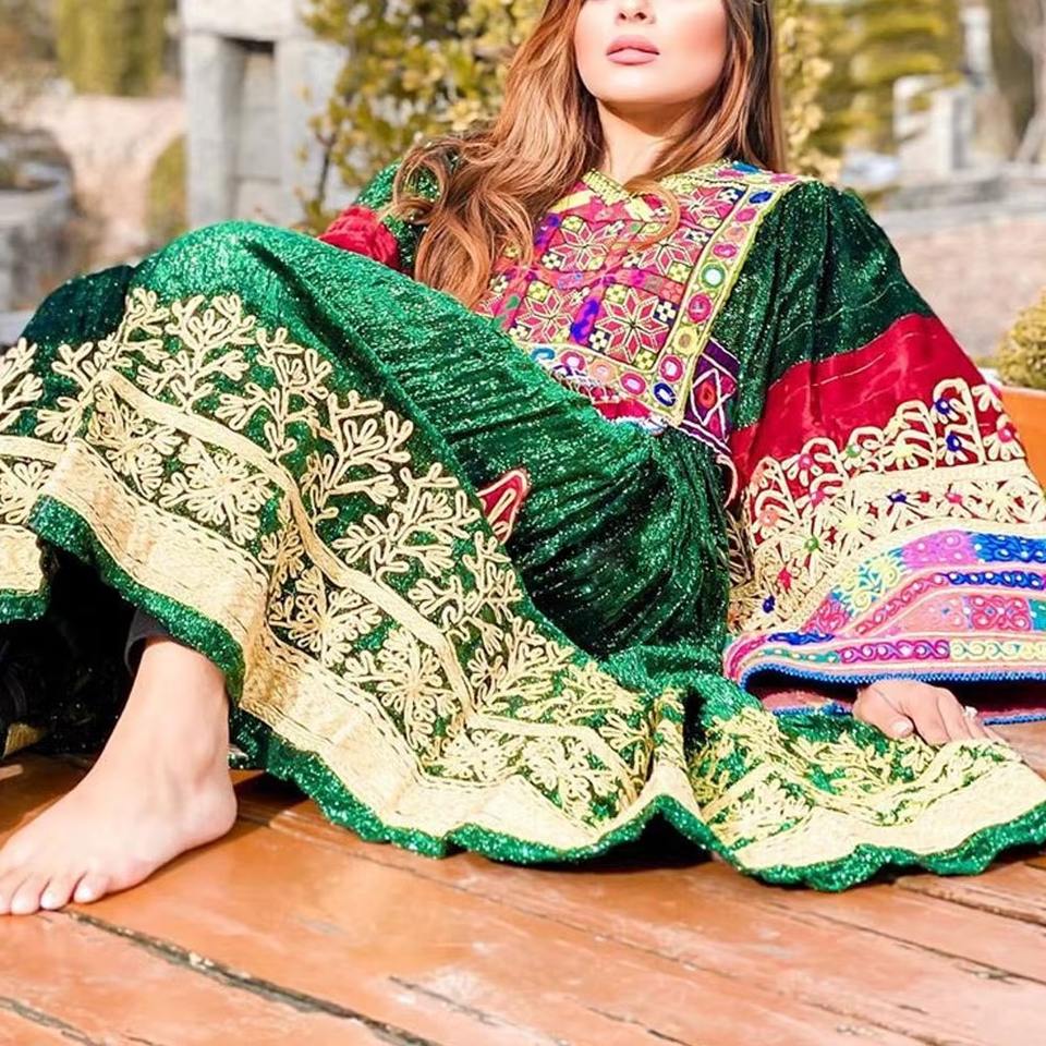 ชุดเดรสแบบดั้งเดิมของอัฟกานิสถานผ้ากำมะหยี่สีเขียวเข้มประดับด้วยผ้าลูกไม้หลากสีปักลายเรขาคณิตสดใส