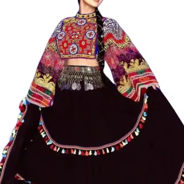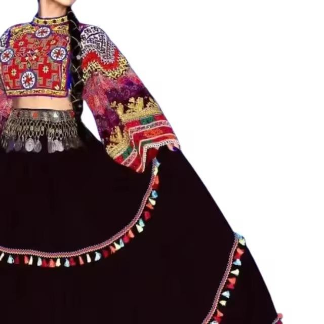 เสื้อครอปท็อปแบบดั้งเดิมของชาวอัฟกันชนเผ่ากุจิ พร้อมงานปักลายโมเสกหลากสี และกระโปรงทรงวงกลมสีดำประดับพู่และสีเงิน