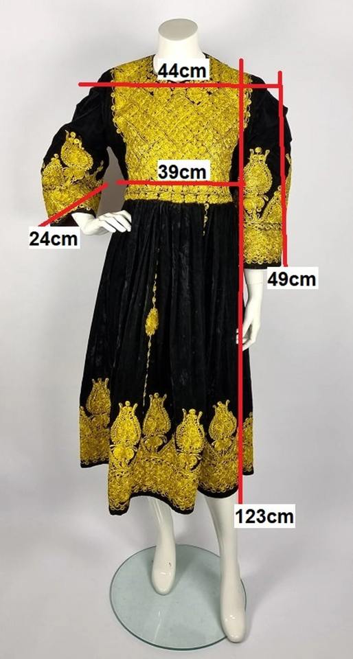 ชุดเดรสยาวแบบดั้งเดิมของอัฟกานิสถาน พร้อมลายปักโมเสคสีสันสดใส กระโปรงทรงบานยาวเต็มตัว และตกแต่งด้วยงานกระจก