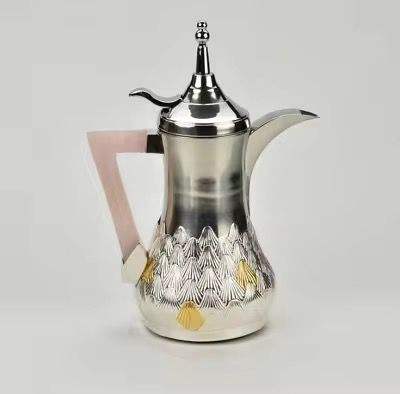 Traditional Arabic Coffee Pot Dallah Polished Silver Finish Gold Accents Engraved Patterns Cultural Kitchenware Elegant