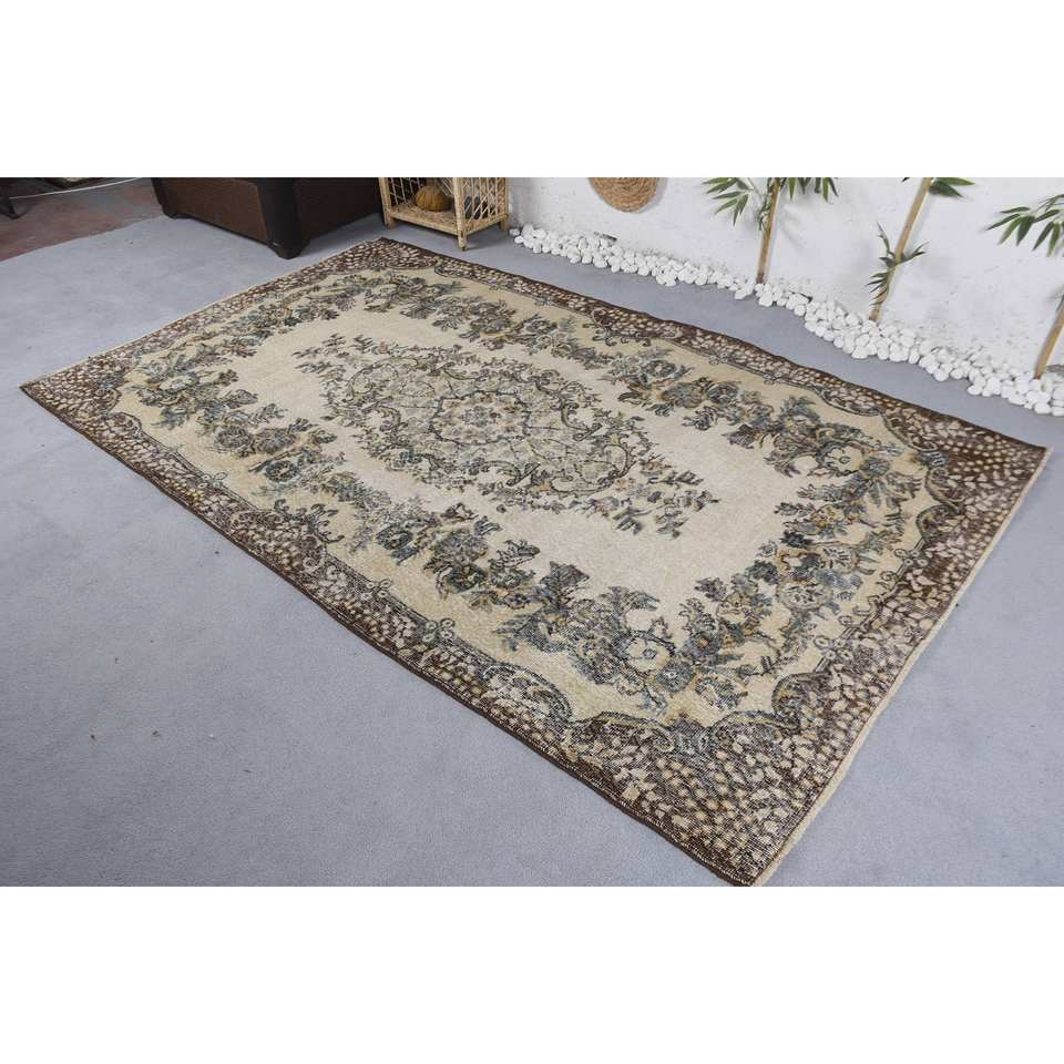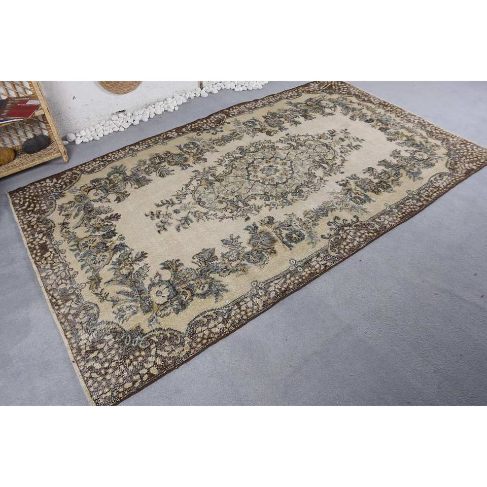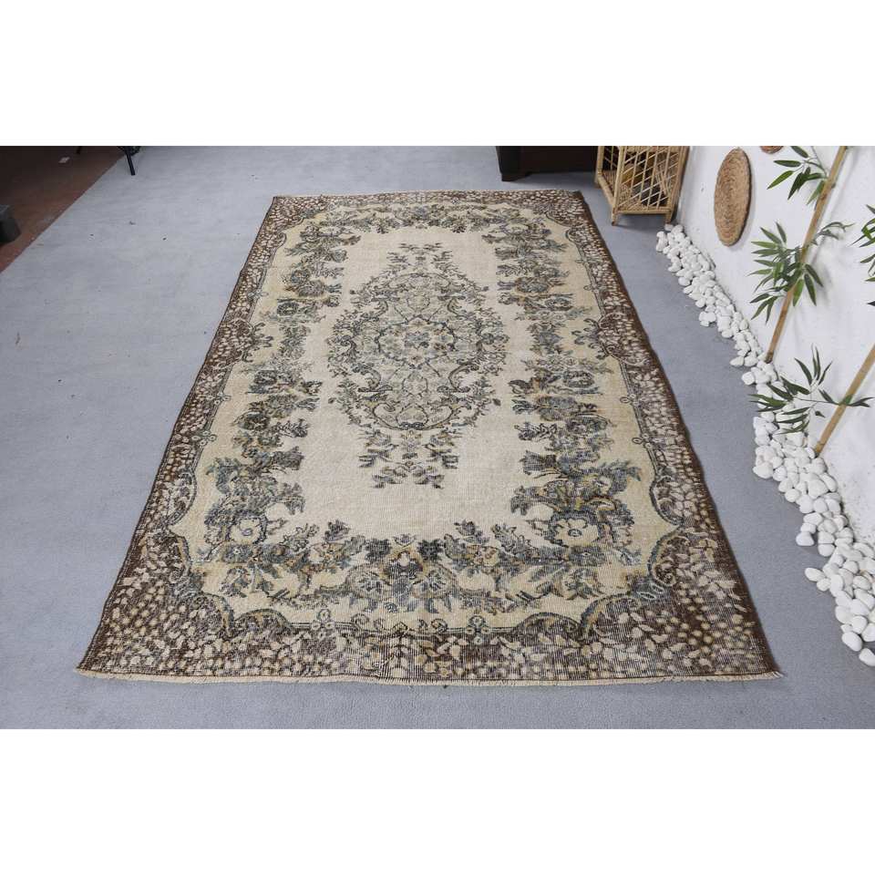 พรมขนสัตว์สีเบจสีน้ำตาลแบบดั้งเดิม9ft 5.3 x แนววินเทจแบบเย็บปะต่อตุรกีสำหรับตกแต่งห้องนั่งเล่นวัยรุ่นห้องโถงยางสี่เหลี่ยม