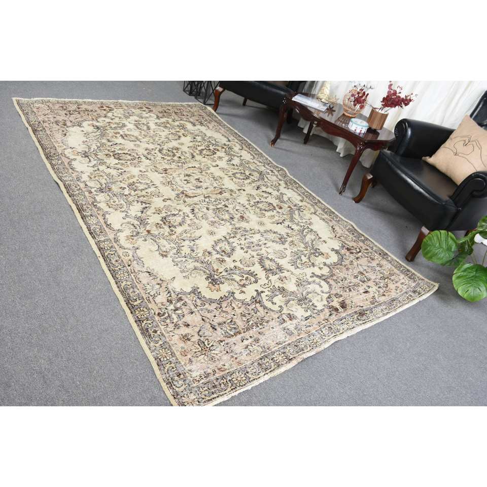 พรมขนสัตว์สีเบจแบบดั้งเดิม9.2ft 5.5 x แบบแฮนด์เมดตู้เก็บเสื้อผ้าตุรกีดีไซน์สี่เหลี่ยมผืนผ้าสำหรับห้องนั่งเล่นพร้อมแผ่นรองยาง