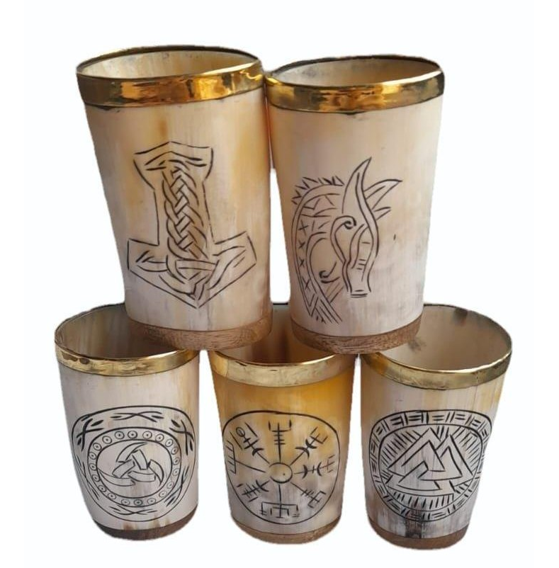 แก้วบัฟฟาโลฮอร์นแก้วขอบทองเหลืองแบบดั้งเดิม5ชิ้นถ้วยแก้วทรงเขาวัว