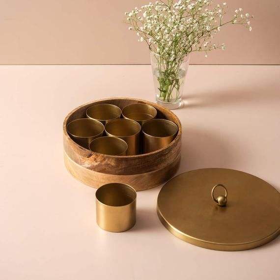 กล่องเครื่องเทศทองเหลืองดีไซน์ดั้งเดิม สำหรับตกแต่งครัวสไตล์ชาติพันธุ์ เพิ่มความโดดเด่นให้พื้นที่ด้วยงานฝีมือโลหะแท้