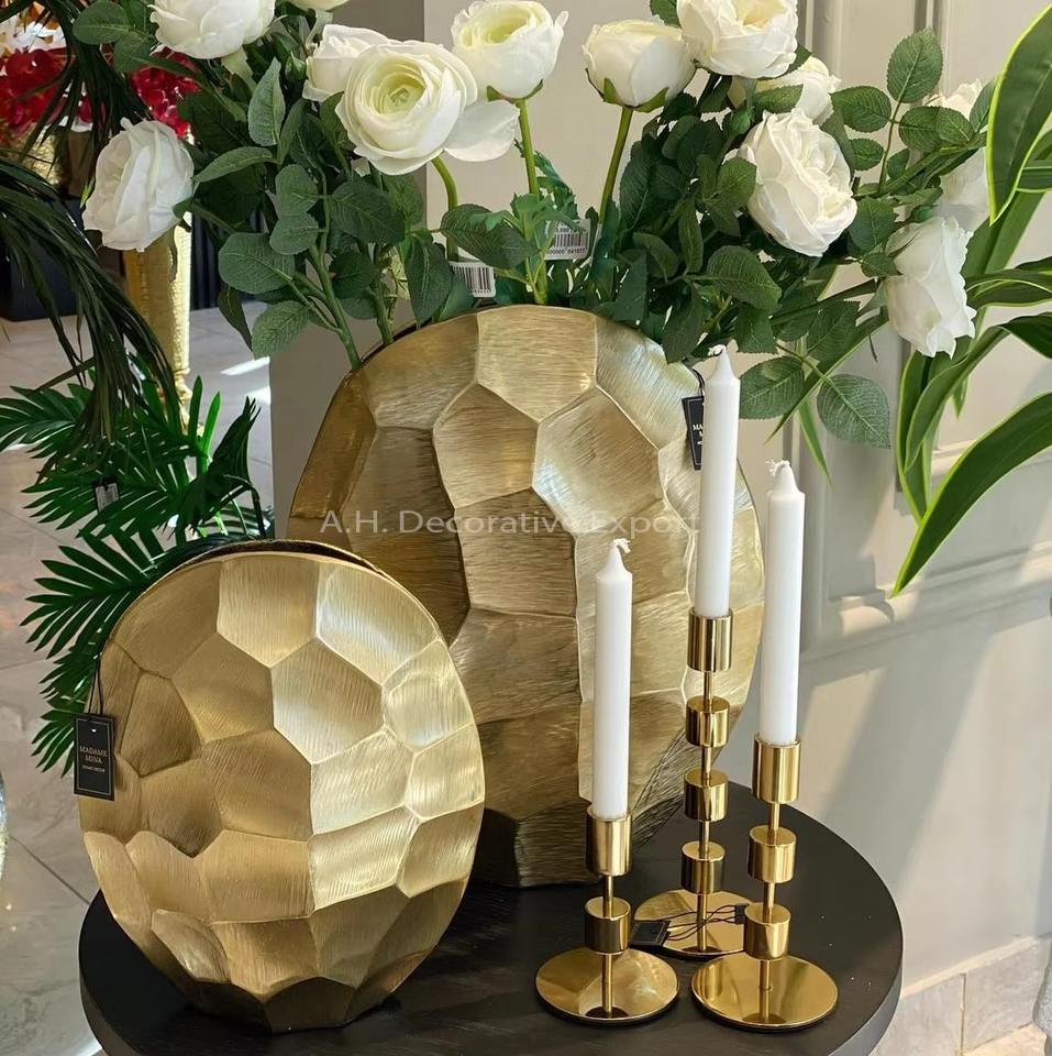 แจกันดอกไม้โลหะสีทองดีไซน์แบบดั้งเดิมตกแต่งด้วยลวดลายสวยงามสำหรับตกแต่งตามธีมขายส่งจากอินเดีย