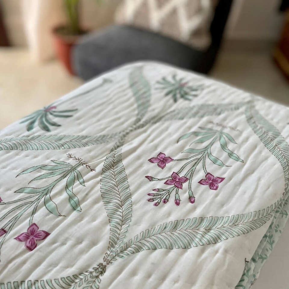 ผ้าห่ม jaal สีเขียวมรกตแบบดั้งเดิมพิมพ์ลาย dohar 100% ผ้าฝ้ายแบบกลับด้านได้สองชั้นตะเข็บด้วยมือขนาด90*108 "ผ้าห่มด้านหลัง