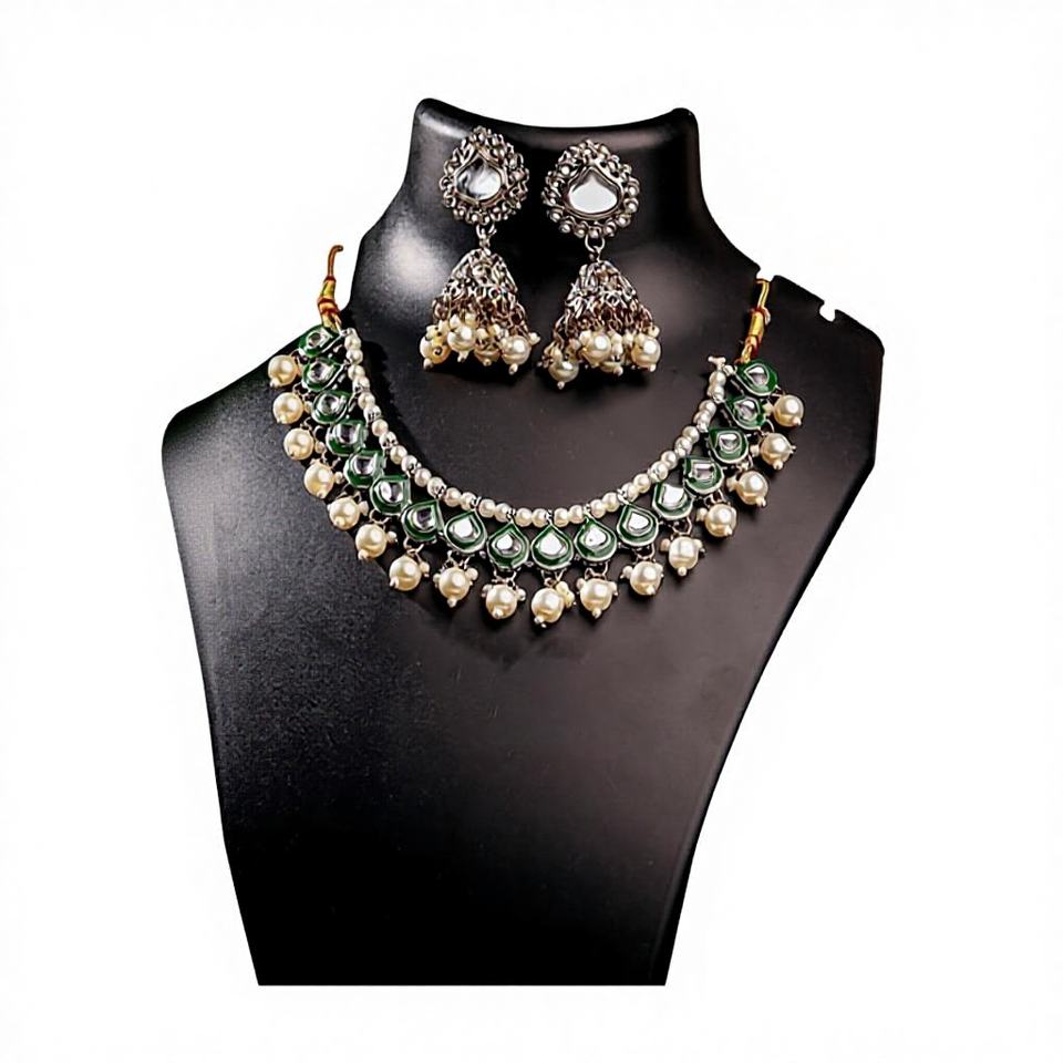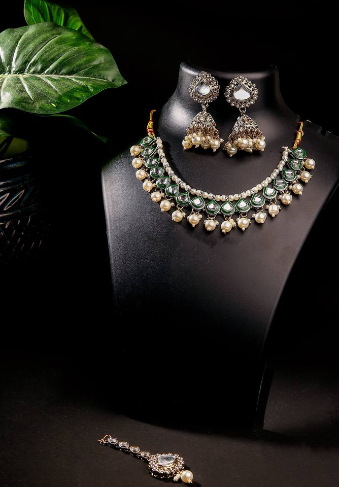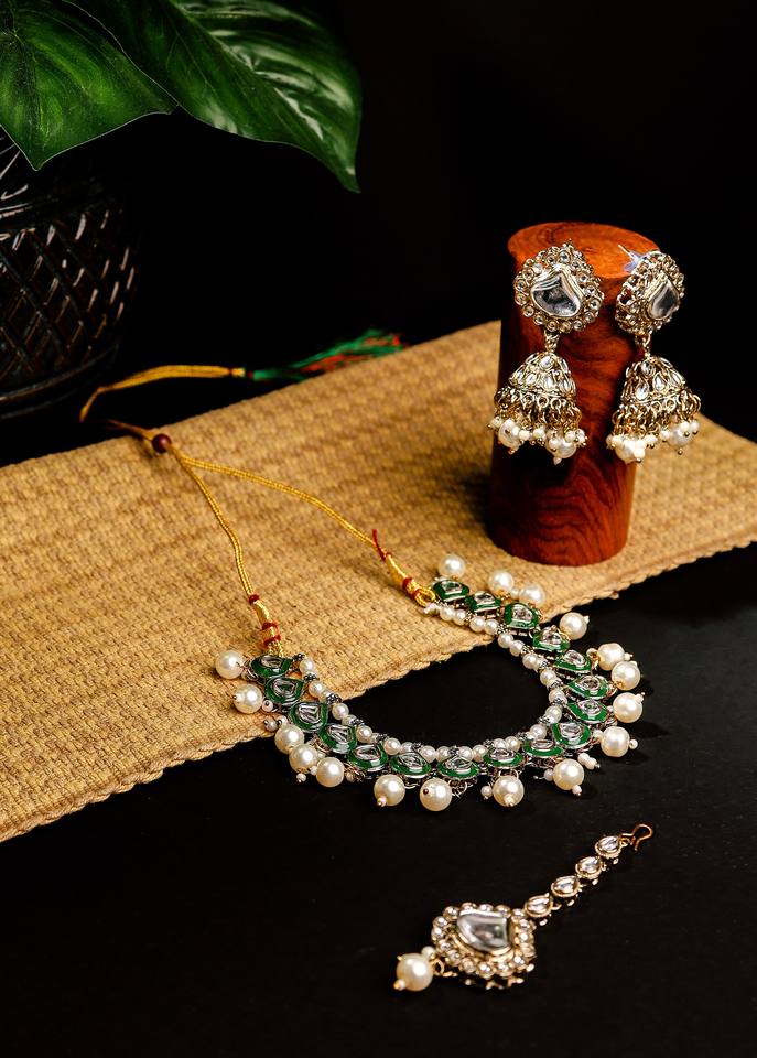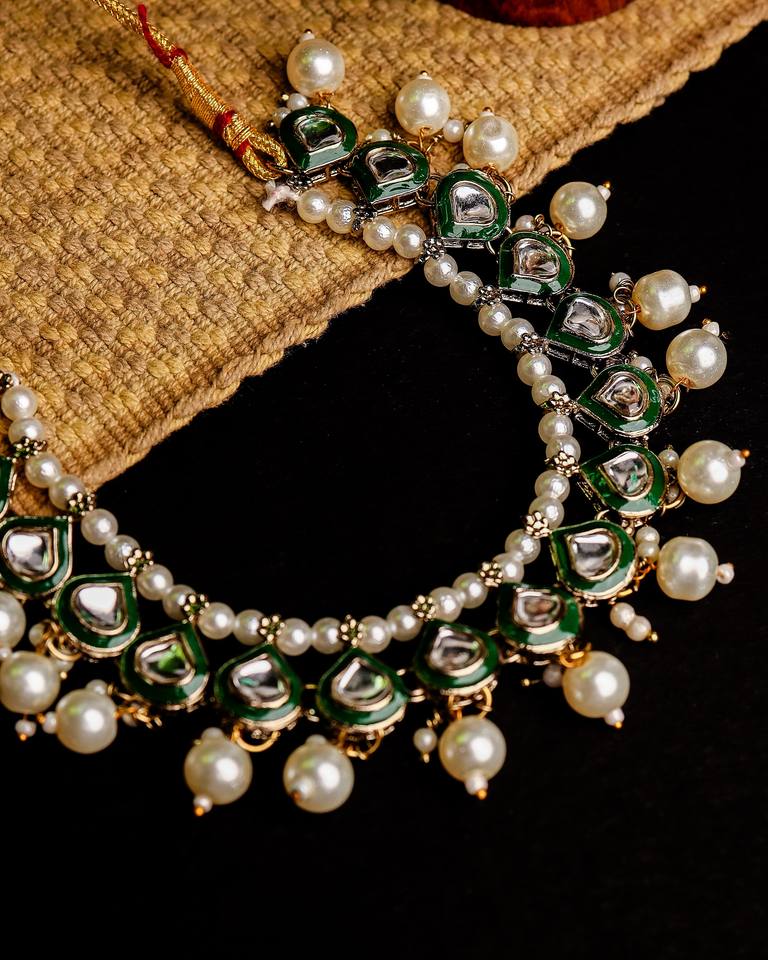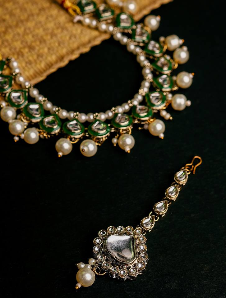 ชุดเครื่องประดับสร้อยคอและต่างหูแบบคุนดัน ดีไซน์ดั้งเดิมประดับเพชรซิร์คอน ชุบทองโบราณ สีเขียวมีนาคารี สำหรับผู้หญิง เหมาะสำหรับงานแต่งงานและงานปาร์ตี้