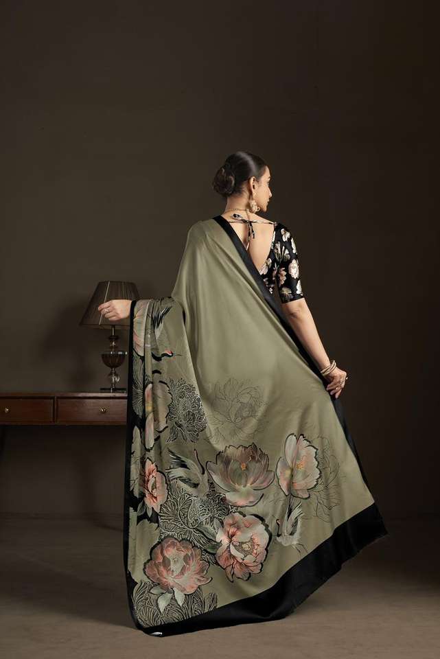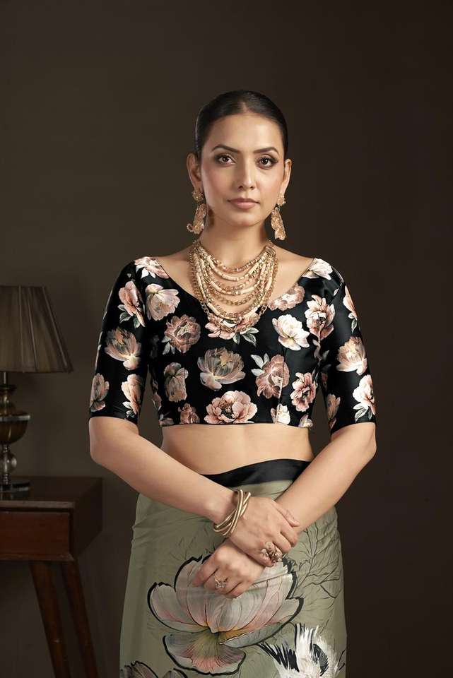 ผ้าซารีอินเดียลายดอกไม้แบบดั้งเดิมพร้อมสวมใส่ ผ้าไหมเครป พร้อมเสื้อปักลายดิจิทัลสำหรับงานปาร์ตี้