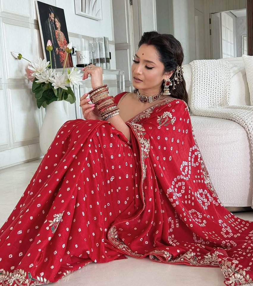 ผ้าไหมกากีแบบดั้งเดิม ลายบันดานี พร้อมงานปักกอต้าปาตติทำมือ ผ้าส่าหรีแบบดั้งเดิมที่สมบูรณ์แบบสำหรับงานแต่งงาน งานเทศกาล และงานเลี้ยง