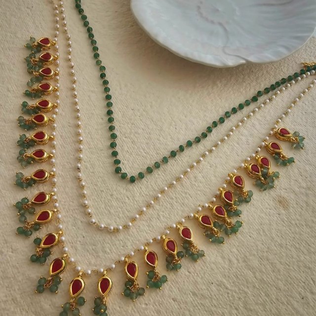 สร้อยคอทองเหลืองชุบทองแบบดั้งเดิมประดับด้วยพลอยรูปหยดน้ำสีแดงทับทิม พร้อมจี้ลูกปัดสีเขียวและโซ่ไข่มุกสำหรับเจ้าสาวในงานมงคล