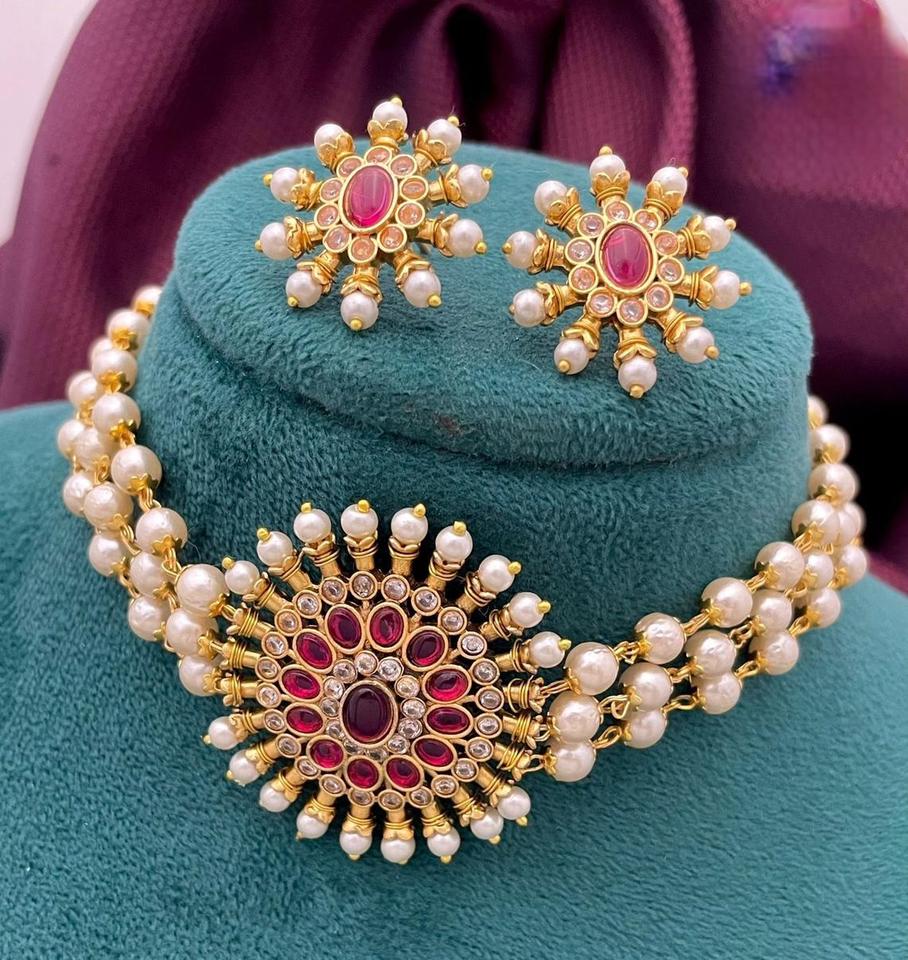 ชุดเครื่องประดับ Kundan โทนสีทองแบบดั้งเดิมสำหรับผู้หญิงสร้อยคอสไตล์งานแต่งงานพร้อมต่างหูดีไซน์คลาสสิก