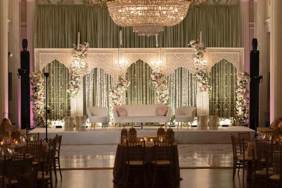 เส้นใยสีทองแบบดั้งเดิมฉากหลังเวทีแต่งงานแกะสลักแกรนด์ศรีลังกา mandap สำหรับงานปาร์ตี้และใช้ในบ้าน