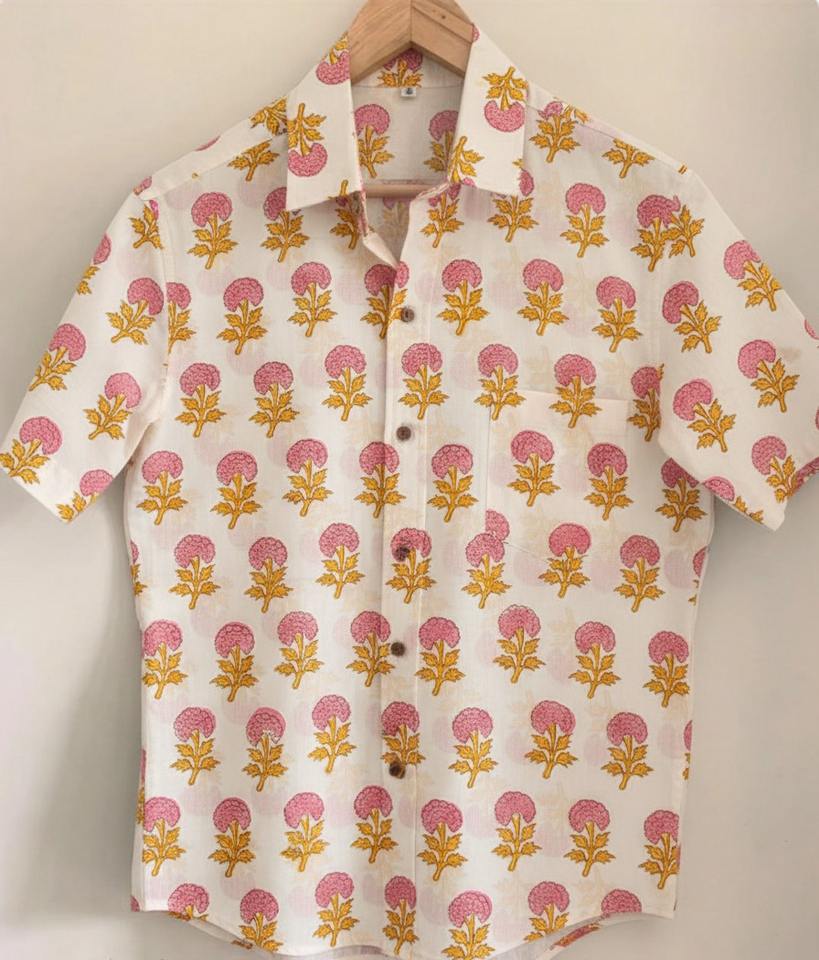 เสื้อเชิ้ตผ้าฝ้ายพิมพ์ลายบล็อกมือ