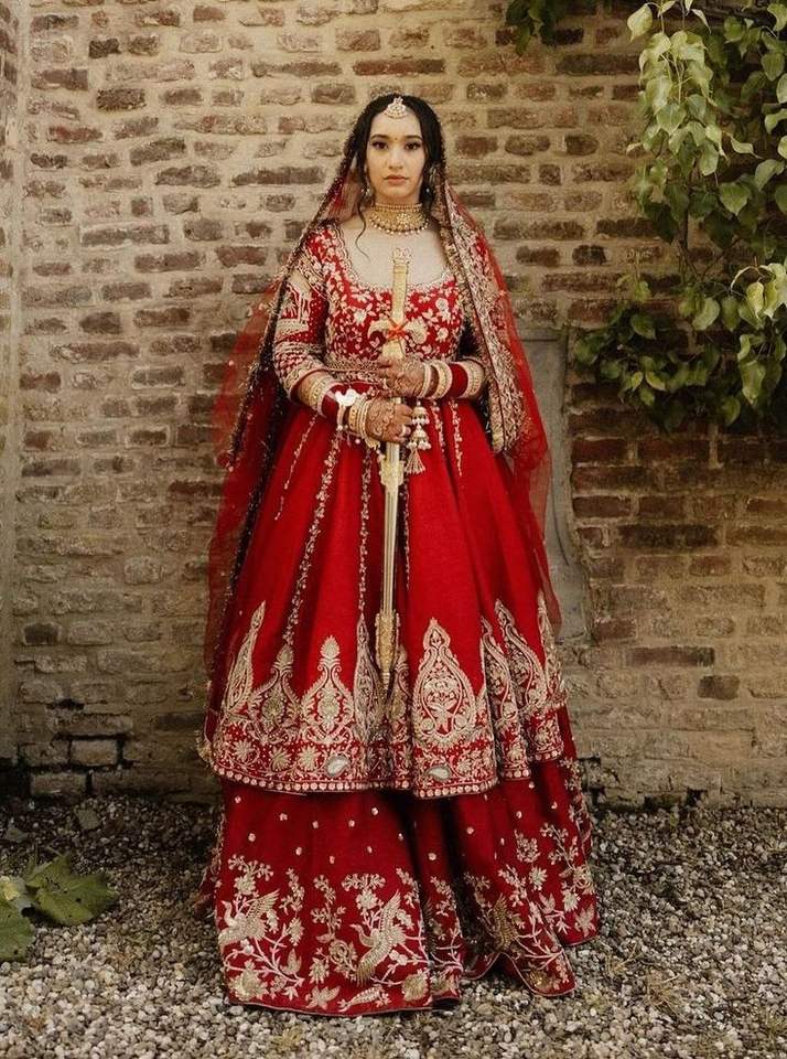 ชุดเจ้าสาวแบบดั้งเดิมของอินเดียและปากีสถาน ประกอบด้วยเสื้อเปปลัม เลเฮนกา และผ้าคลุมไหล่ ดีไซน์ปี 2025 พร้อมงานปักที่งดงามสำหรับงานแต่งงาน