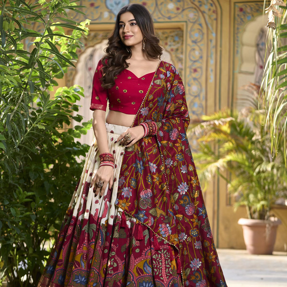 Lehenga Work:Kalamkari Print With Foil Work Border
