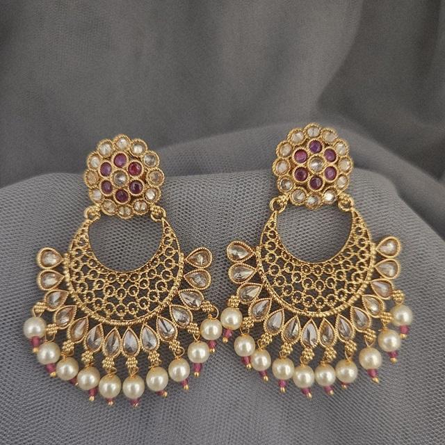 ต่างหูทองเหลืองชุบทองแบบดั้งเดิมประดับด้วยคันดัน โพลกี จุมก้า พร้อมมุก เหมาะสำหรับงานแต่งงาน งานหมั้น งานเลี้ยง และเป็นเครื่องประดับแฟชั่นสำหรับผู้หญิง