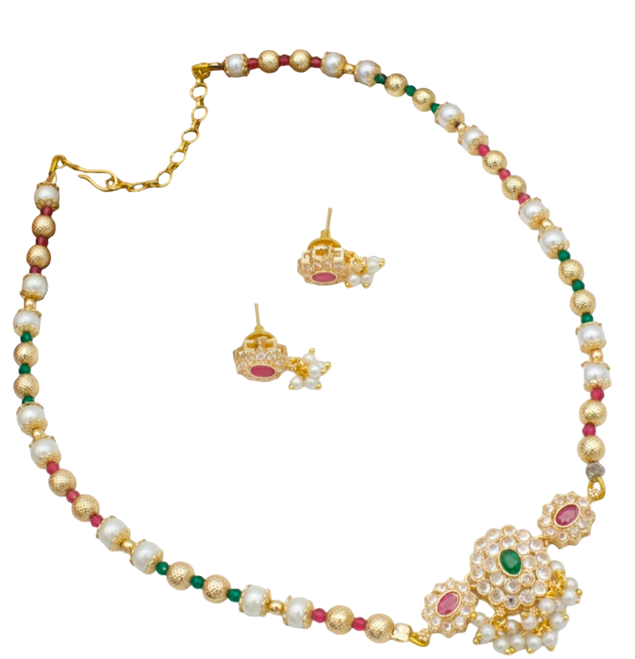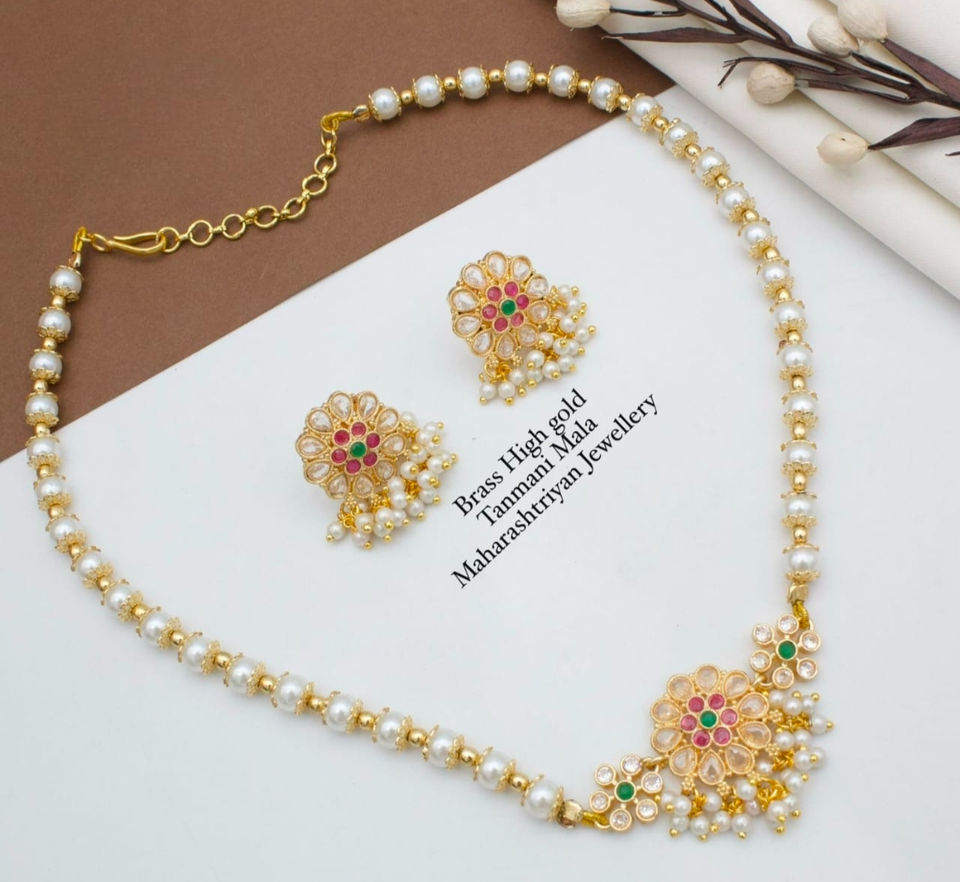 สร้อยคอทันมานีมาลาแบบดั้งเดิมทำจากทองเหลืองชุบทองแบบดั้งเดิมทำด้วยมือชุดลูกปัดสีแดงและสีขาว