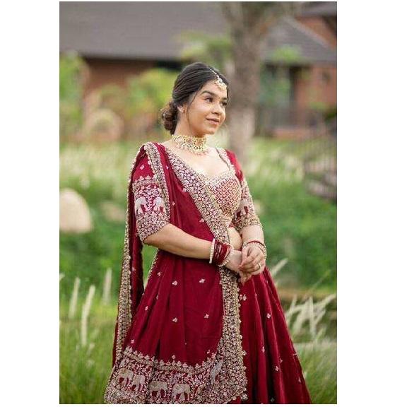 ชุดเลนกาโชลีเจ้าสาวแบบดั้งเดิมสีแดงเลือดหมู พร้อมงานปักด้วยด้ายหนัก ประดับเลื่อม และผ้าคลุมไหล่แบบลาต์กัน สำหรับพิธีแต่งงาน