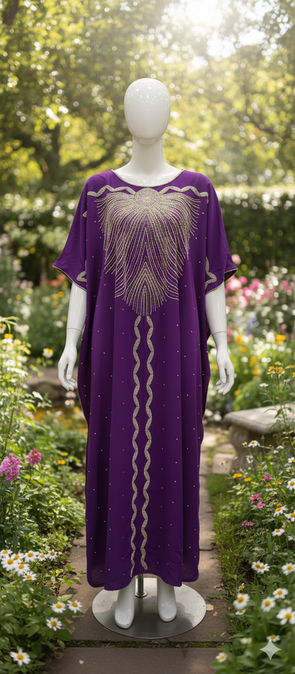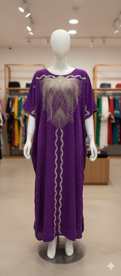 ชุดจาลาบียะห์สีม่วงสไตล์โมร็อกโกแบบดั้งเดิมพร้อมงานปักลายเงินประณีต – ชุดราตรีดีไซน์เนอร์ระดับพรีเมียมสำหรับผู้หญิง
